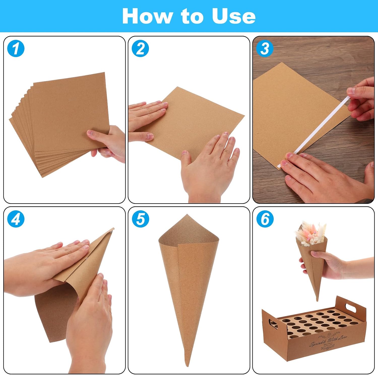 • Instruction - Confetti cones and confetti cone boxes will be sent to you in flat paper form. You only need to roll up the square paper and make it into a cone according to your needs, then fix it with glue/tape (not provided), and then follow the steps to fold the paper cone box to complete the installation.