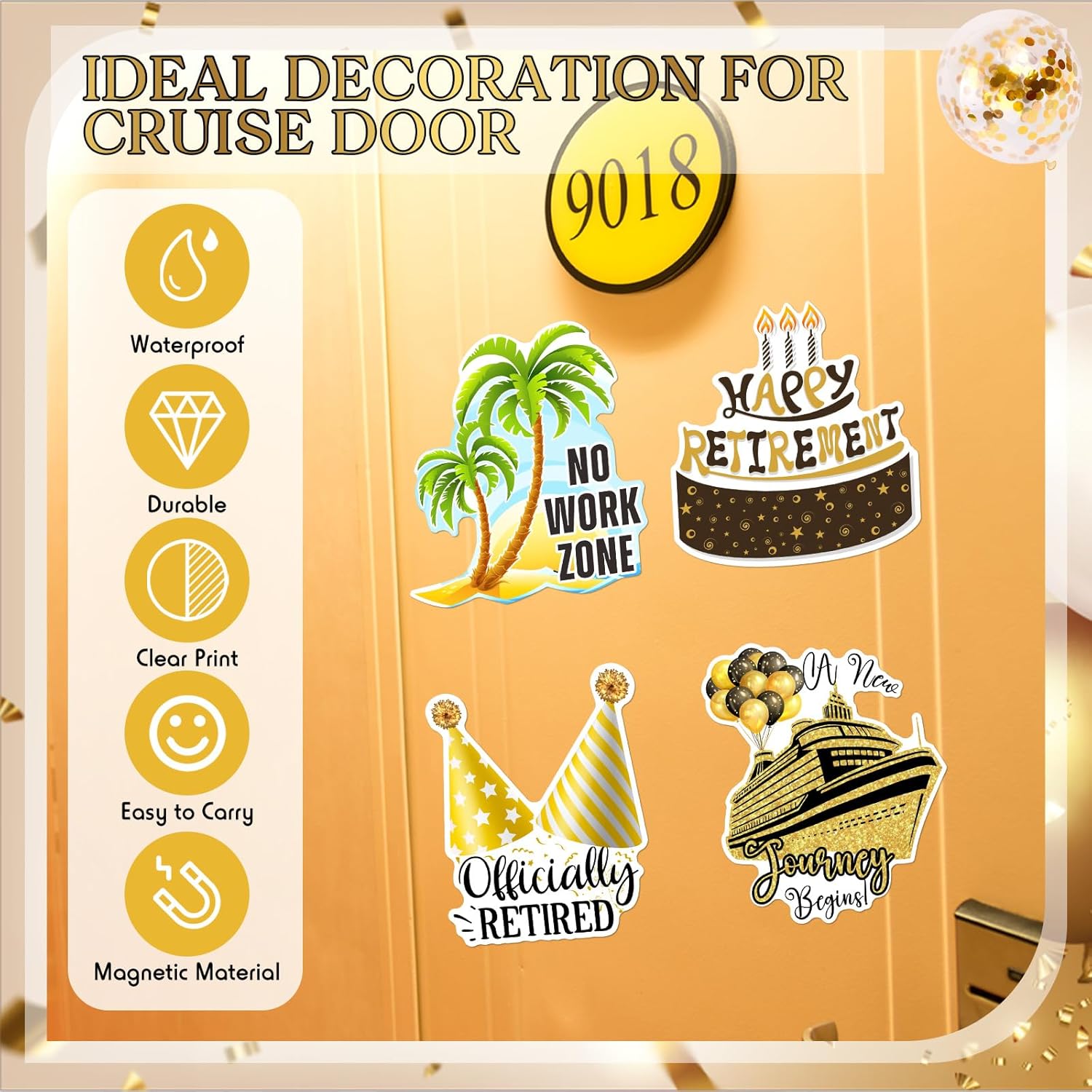 • My First Cruise theme: these cruise door magnets are designed with many funny patterns, such as cruise ships, cake, retire balloons, celebration hat, and so on, attractive and interesting, ideal for you to decorate your cruise ship door, can quickly identify the room number, suitable for the first time to take a cruise