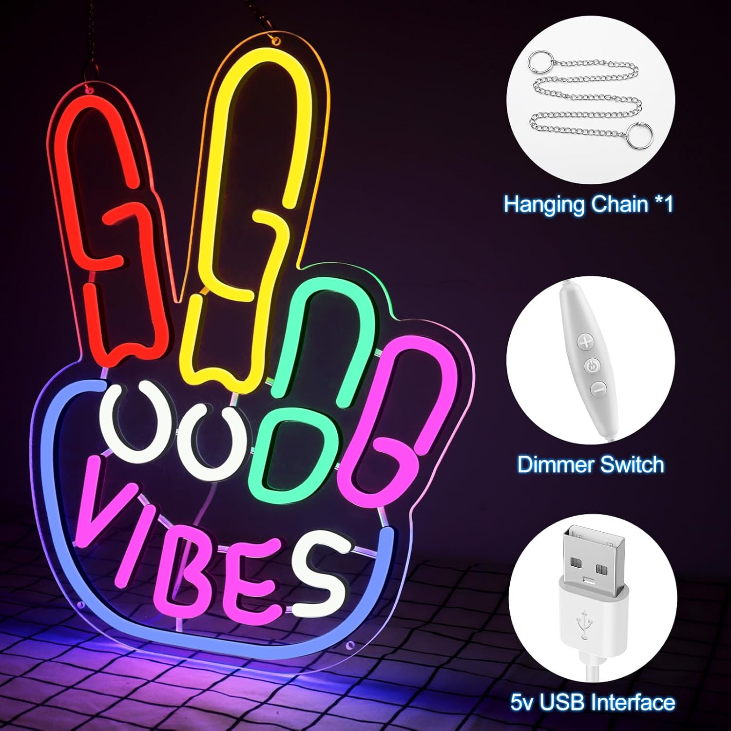 Good Vibes Neon Sign, Yeah Good Vibes Neon Sign for Wall Decor, Dimmable USB-Powered Sign with ON/OFF Switch, Colorful LED Light-Up Sign for Bedroom, Nursery, Club, Bar, and Party Decor