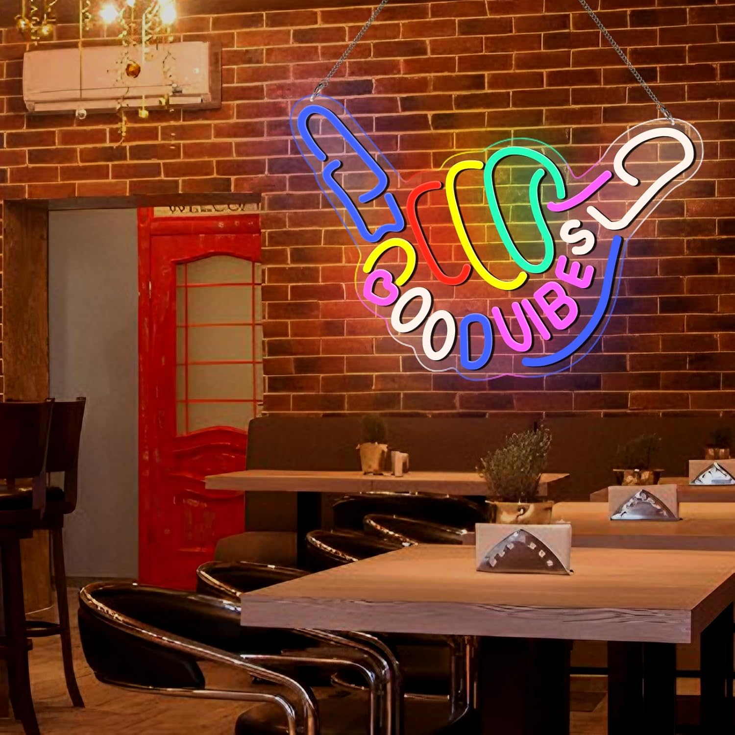 • UNIQUE NEON LIGHT DECOR: The good vibes neon sign is perfect for both indoor and outdoor wall decorations. The creative gesture design, with bright neon colors, instantly creates a great atmosphere and can be used as a party backdrop to add a unique splash of color to any space, making every gathering more vibrant and fun.