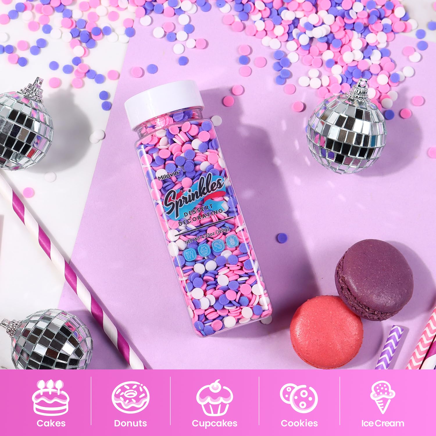 • Confetti Sprinkles for Cake Decorating: A bottle of edible purple, pink and white round sprinkles, whether it's cakes, cupcakes, cookies, ice cream, cake pops, brownies, or any dessert you can dream of; our sprinkles are your go-to for that extra dash of cheer