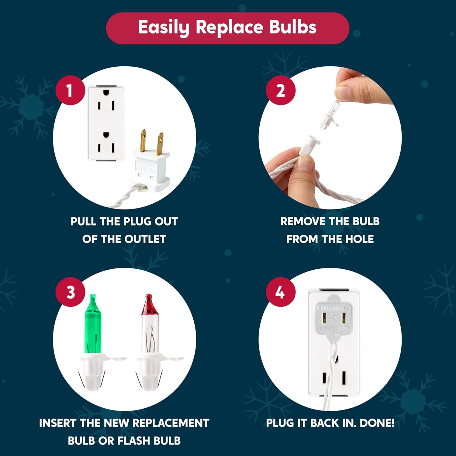 • All-Weather Durability & Independent Bulb Design.Engineered for reliability, these individually wired bulbs ensure that if one burns out, the others remain lit! Constructed with weather-resistant materials to withstand outdoor elements, and includes replacement bulbs and fuses for convenient maintenance—perfect for year-round decorative use.