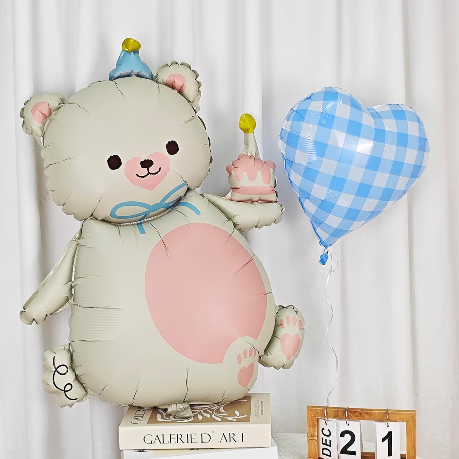 2PCS Matte bear Animal balloon With hat Big Brown bear balloon Holding birthday candle cake bear Foil Balloon for Kids Jungle Safari Zoo Farm Birthday Theme Party Baby Shower Decoration Cream white