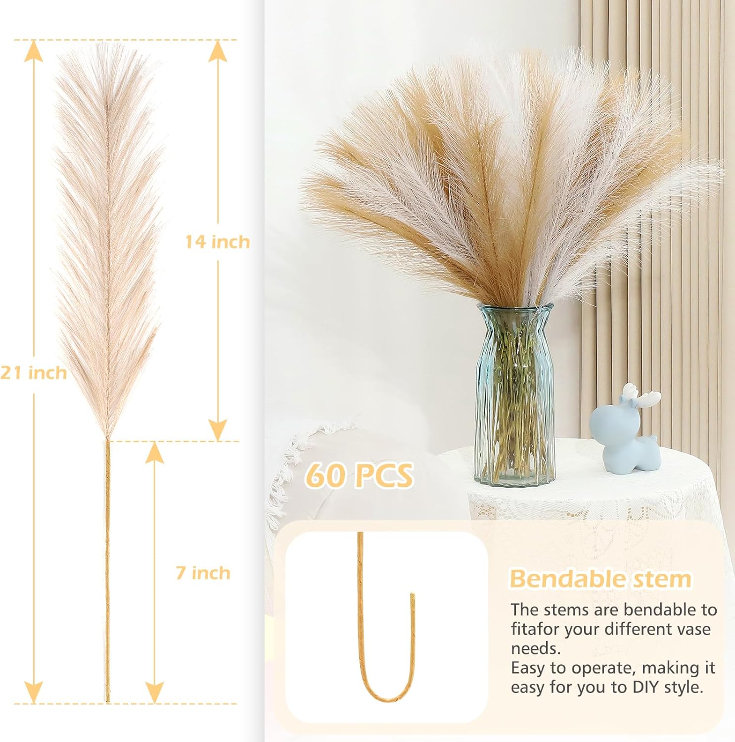 • MULTIPLE SCENARIOS AVAILABLE: Suitable for various spaces, this artificial pampas grass can transform the mood in any corridor, parlor, sleeping quarters, or dining space. It fits seamlessly with both contemporary minimalism and free-spirited bohemian decor, and is also adaptable for floral designs, photography backdrops, and festive adornments.