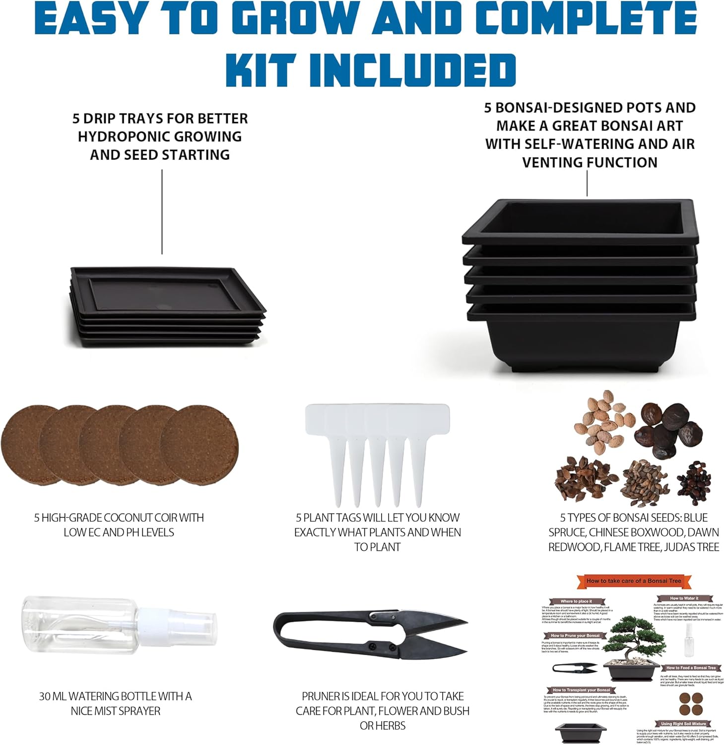 • KIT INCLUDES: 5 types of bonsai tree seeds, 5 plastic pots with drip trays, 5 soil discs, 5 plastic writable plant markers, 1 bonsai pruner, a mini tweezer, a small water bottle and a gardening guide.