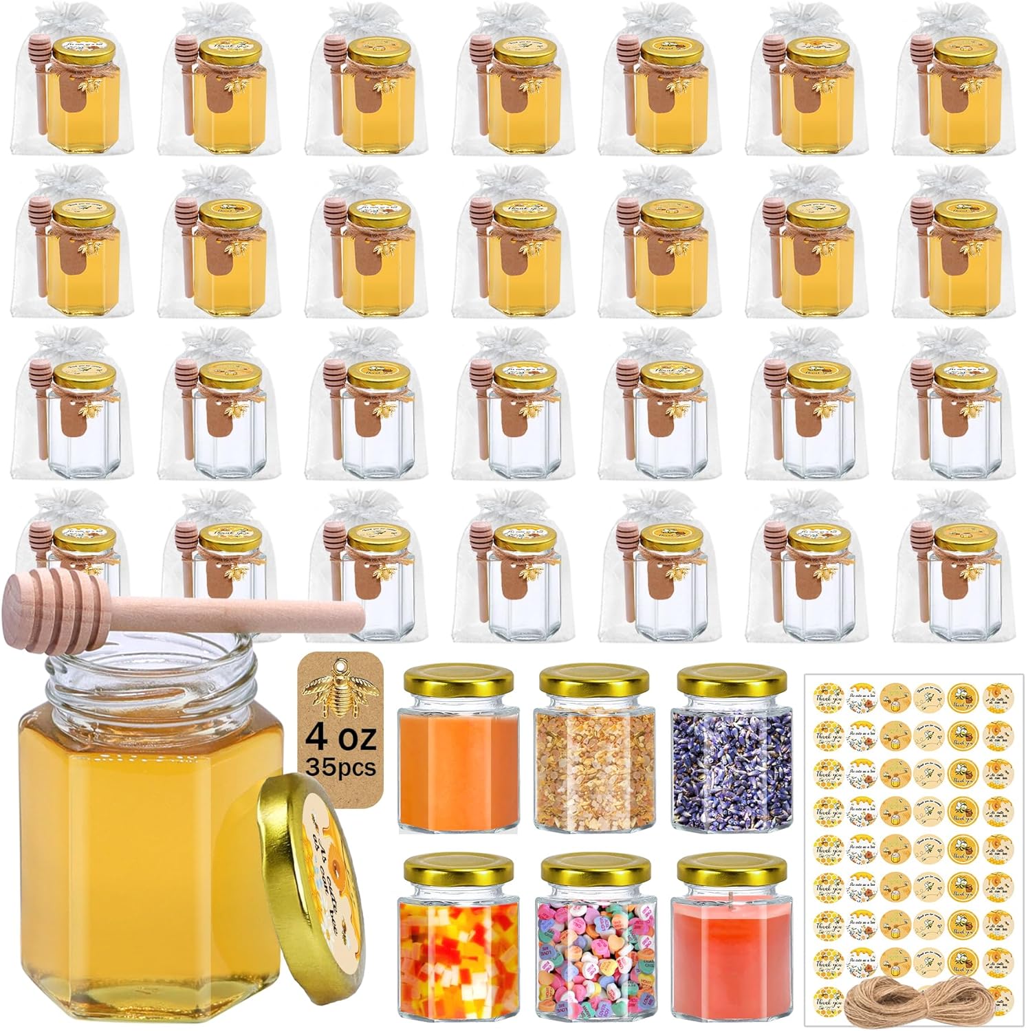 • Great Value Mini Honey Jars Set: This set includes 35 round mini honey jars with dippers, lids, stickers, bee charms, gift bags, tags, and 50m of jute twine. Everything you need to craft thoughtful party favors or sweet handmade gifts with ease.