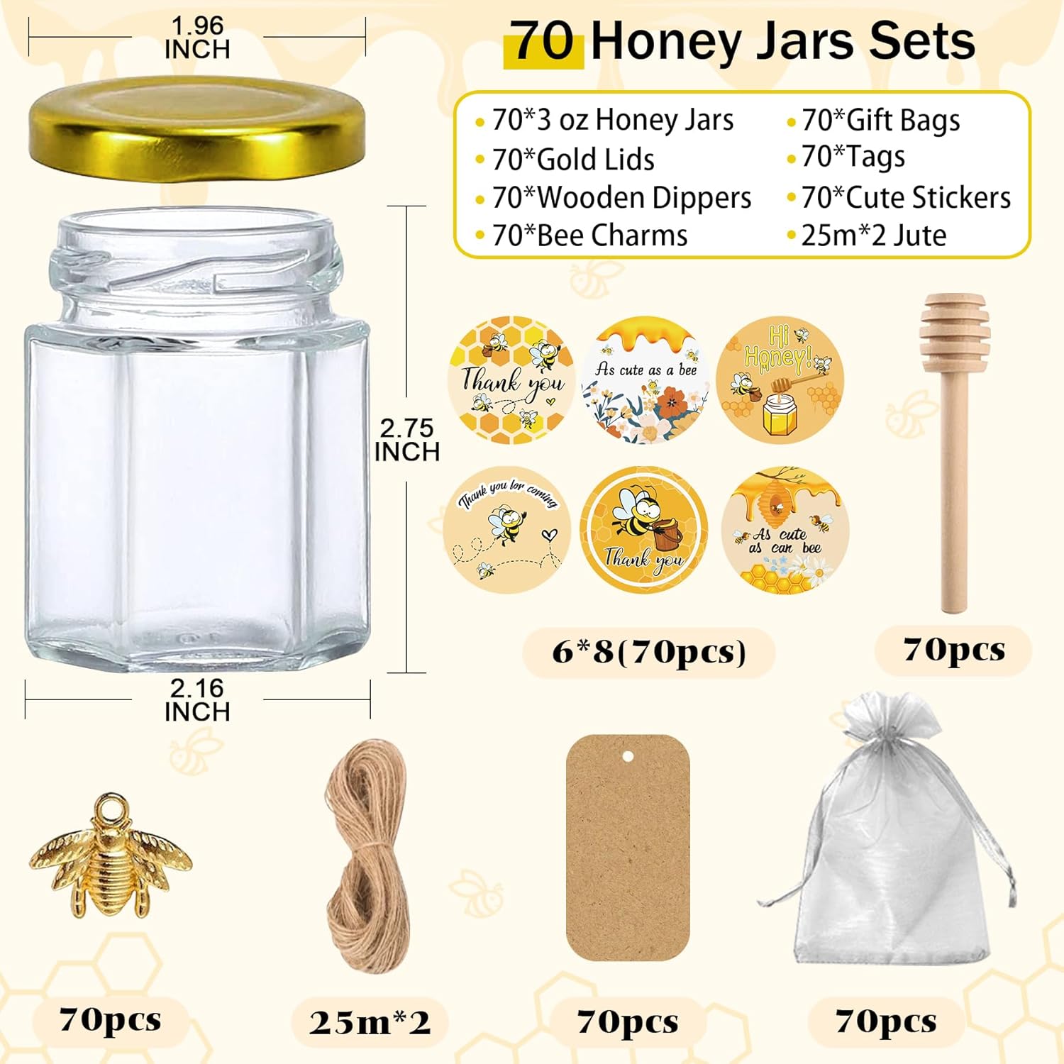 • Great Value Mini Honey Jars Set: This set includes 70 hexagon mini honey jars with dippers, lids, stickers, bee charms, gift bags, tags, and 50m of jute twine. Everything you need to craft thoughtful party favors or sweet handmade gifts with ease.