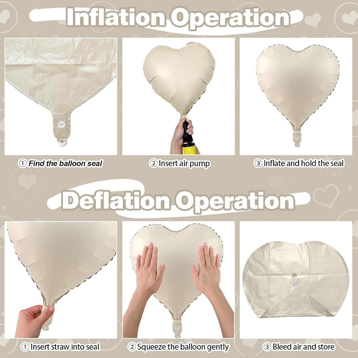 • Easy to Use: The heart foil can inflate with helium or air, can be self-sealed. It is recommended to inflate to 80%-85% to prevent the balloon from bursting. Inflating with helium makes them float, enhancing the effect even more