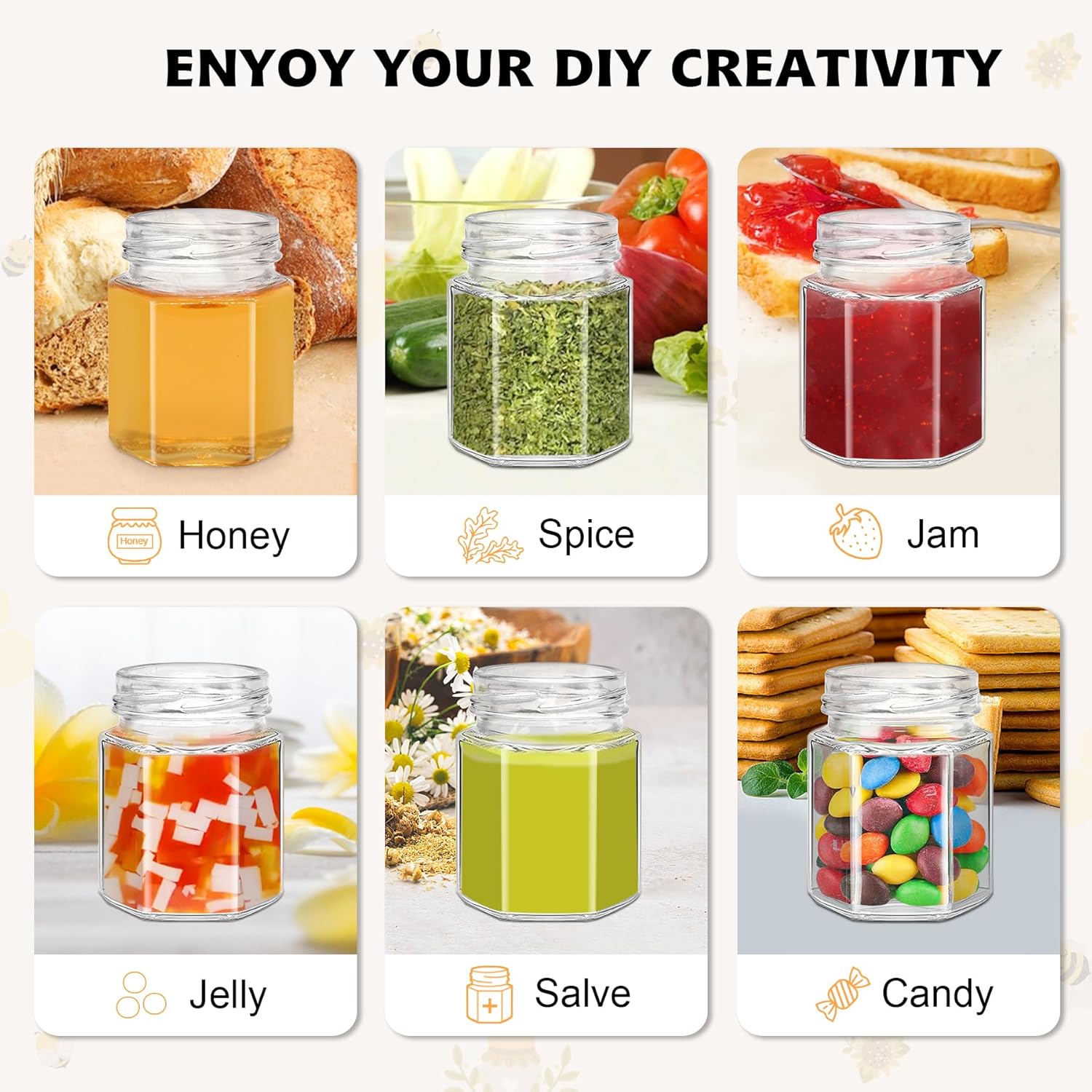 • 【Versatile mini honey jars with dippers】These 3 oz glass honey jars with lids are perfect for honey, spices, or candles. Their timeless design makes them ideal small honey jars for party favors, adding charm to any occasion.
