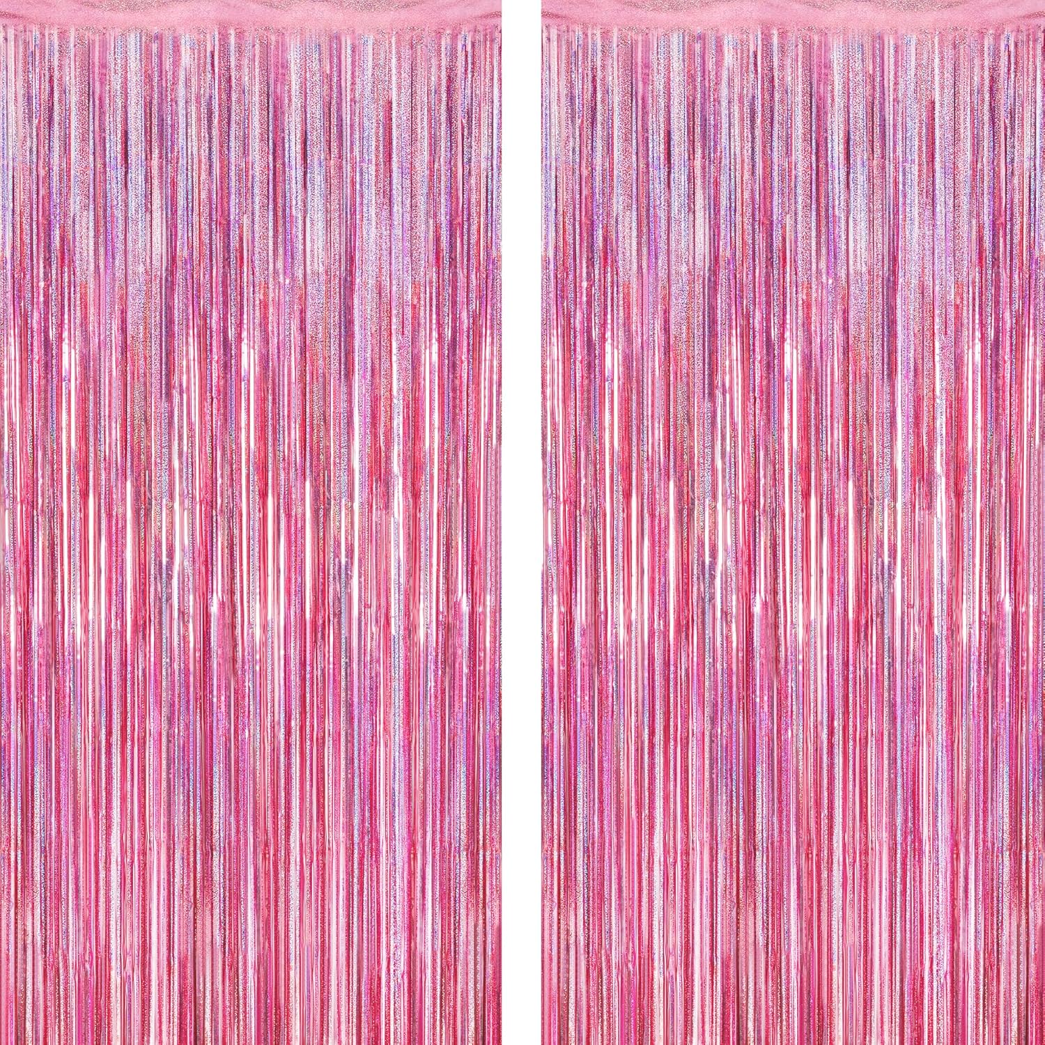 2 Pack Glitter Pink Backdrop, 3.28 FT x 7.05 FT Birthday Party Decorations, Laser Pink Fringe Curtains Foil Streamer Tinsel, Pink Curtains Photo Backdrop Happy Birthday Backdrop