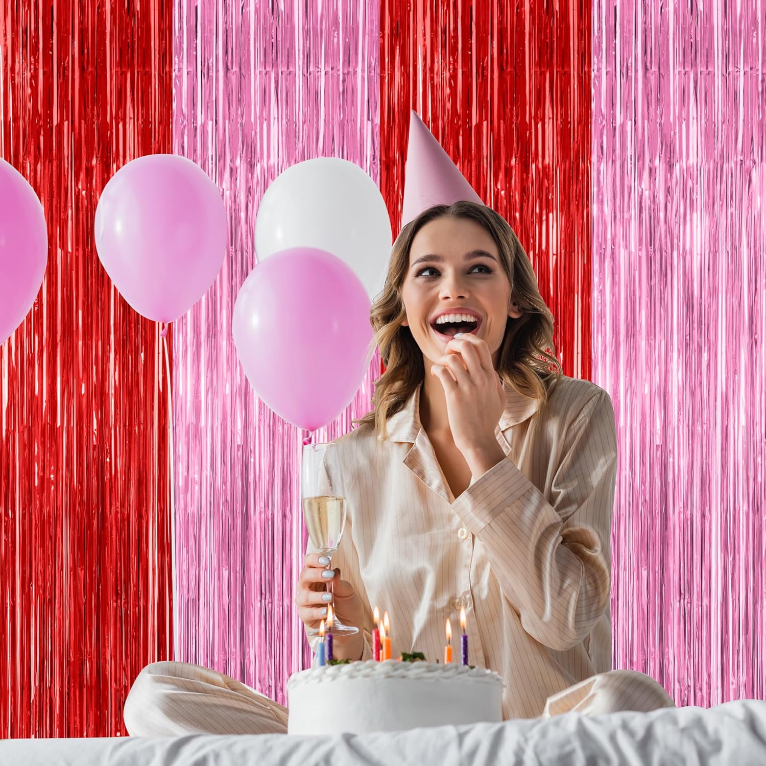 2 Pack Backdrop Curtains, 3.28 Feet x 7.05 Feet Red Pink Backdrop, Metallic Fringe Curtains Tinsel Backdrop Party Streamer, Babie Backdrop Happy Birthday Party Supplies Decorations