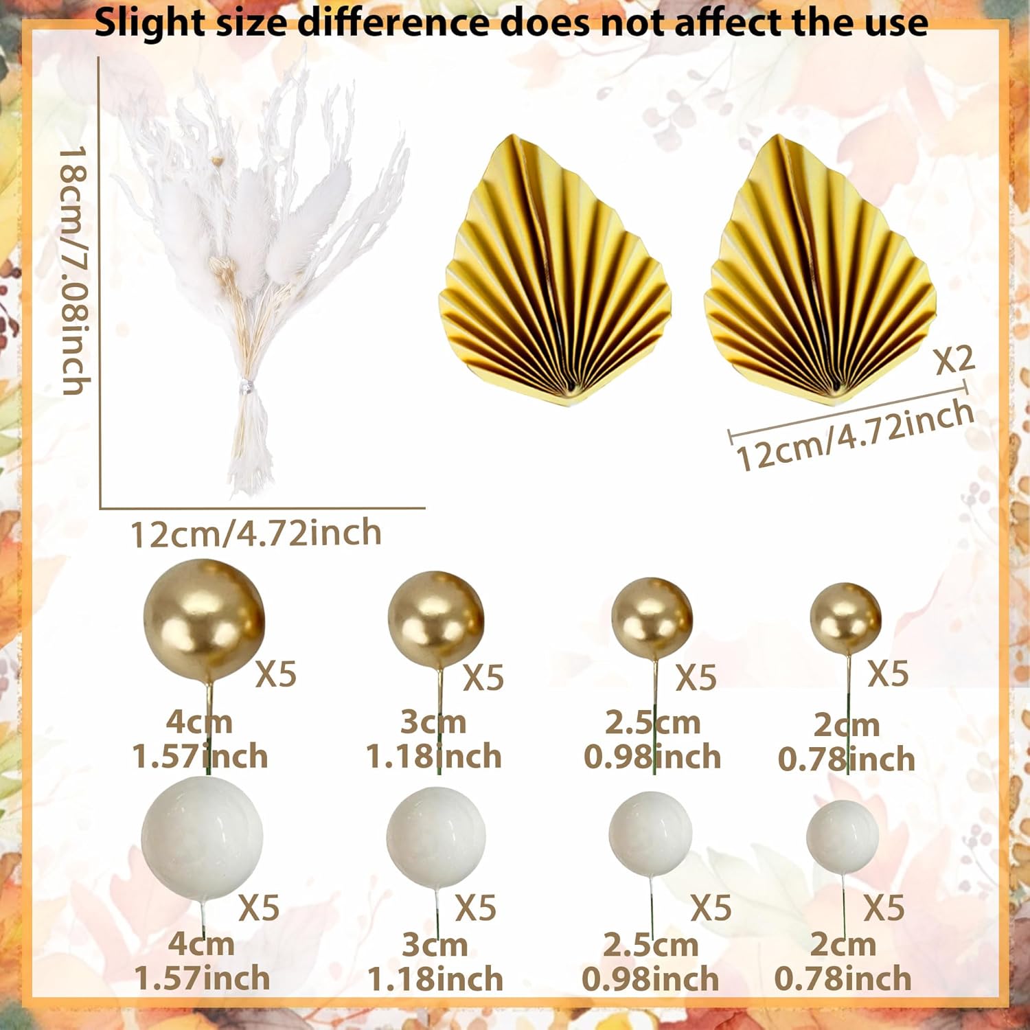 • You will get: 1 bunch rabbit tail grass,2 x gold palm leaves, 20 x gold cake balls, 20 x white cake balls. Size as picture shows