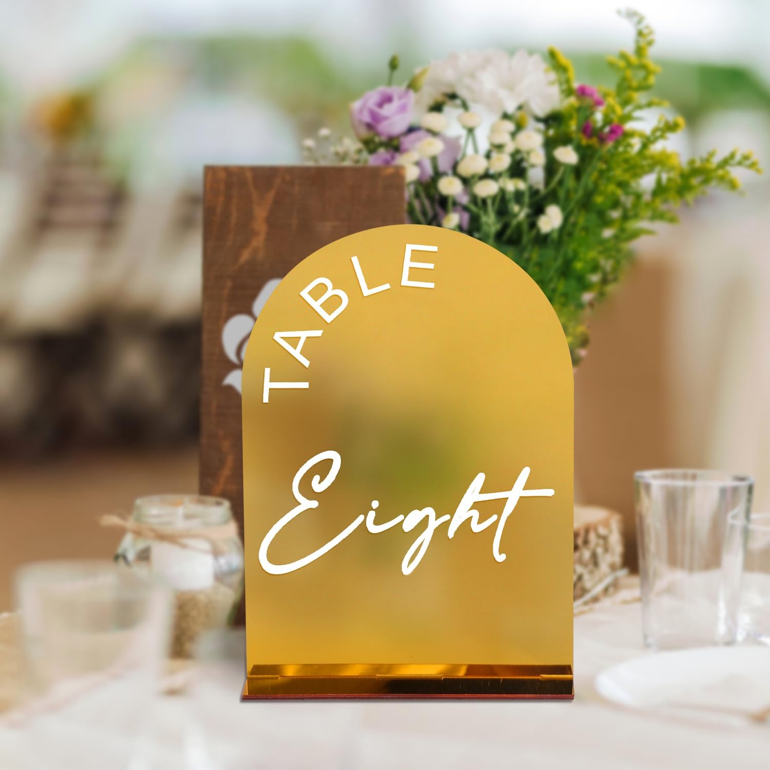 Gold Mirror Arch Wedding Table Numbers 1-30 with Stands, 5x7 Inch Acrylic Arch Sign with Holder for Wedding Reception Table Centerpiece Decoration(Gold Mirror)