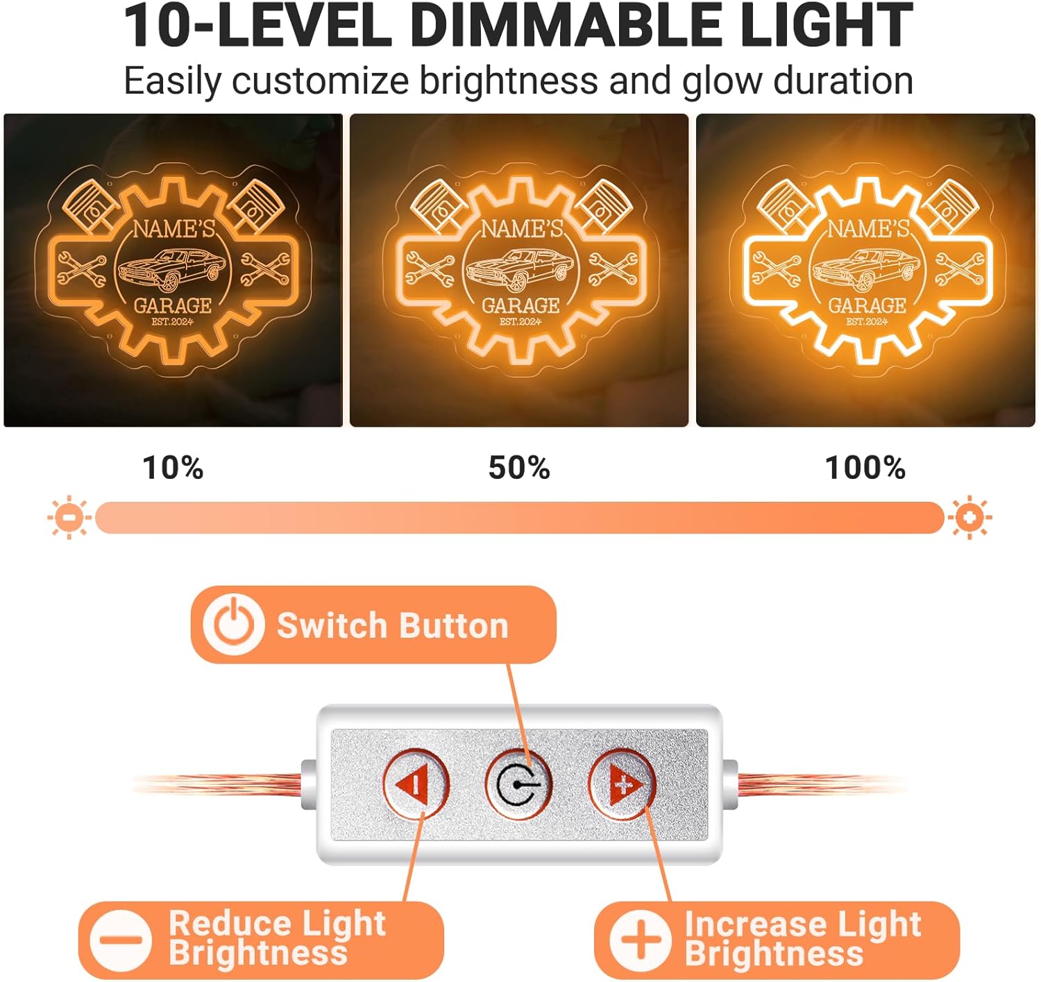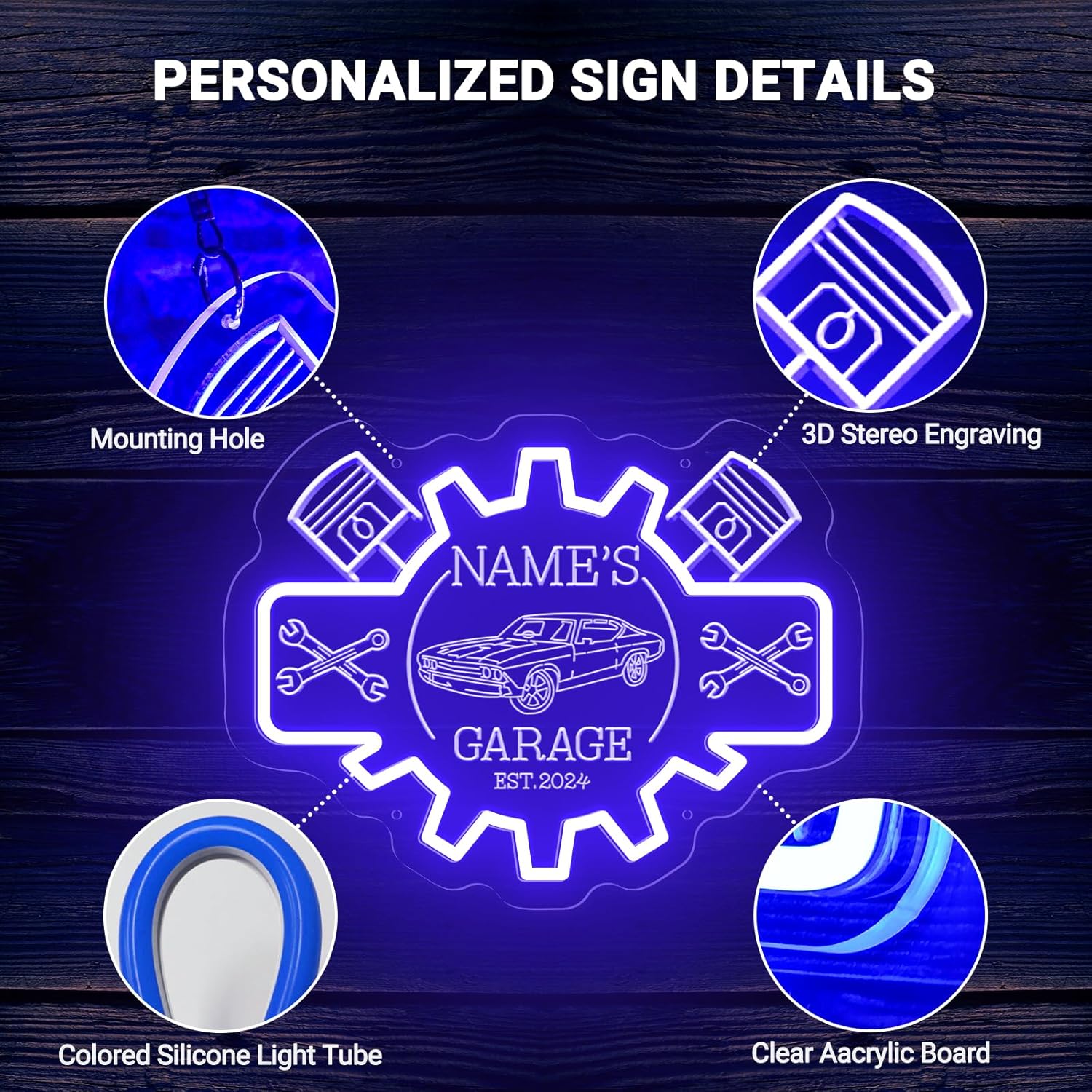 • 【3D Engraving Process】Our personalized garage neon signs feature a upgraded 3D engraving process, where custom text and graphics are etched onto a clear acrylic board. The stereo carvings are colorless and illuminated by vibrant colored LED neon strips that bring out the best 3D lighting, adding depth and brightness to turn any wall into a personalized artwork.