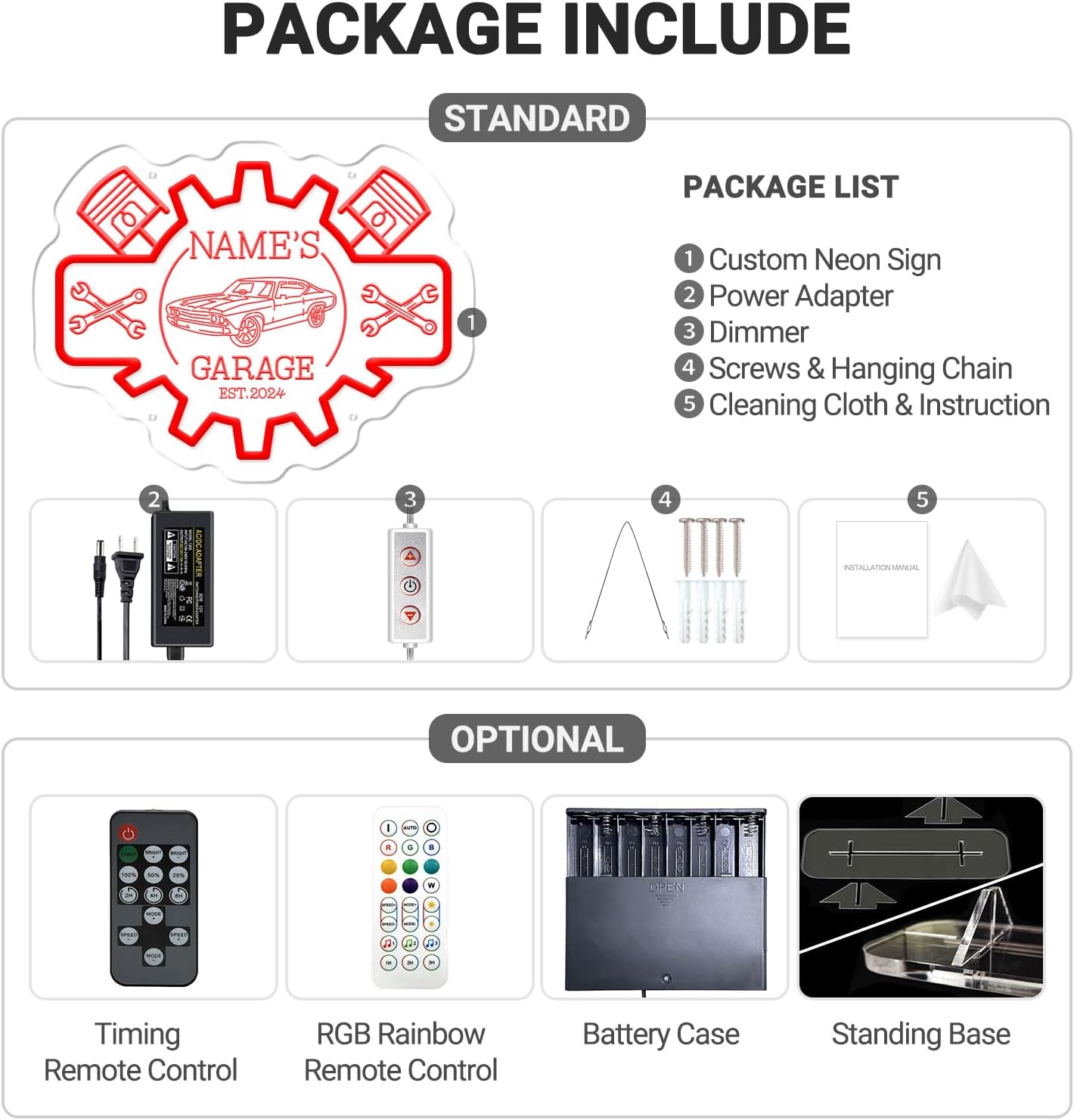 • 【Personalized Garage Signs】The personalized garage neon sign create a romantic, warm and stylish atmosphere for your man cave and garage decor. Choose your favorite size and color, enter your custom text and so on and tailored to your decoration theme to create a truly belong you one-of-a-kind led sign. Click the "Customize Now" button to start!