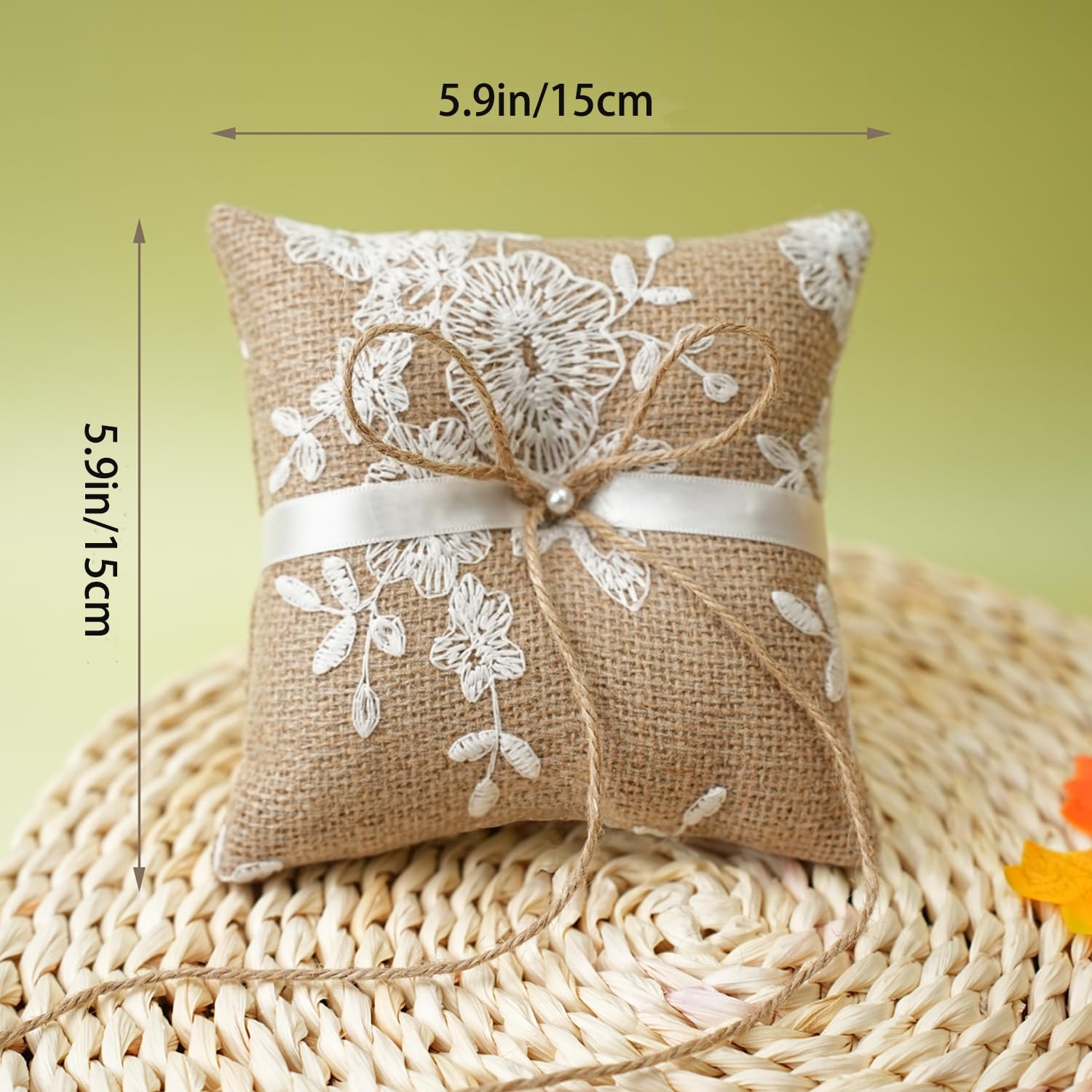 QIRMIZI Vintage Rustic Burlap Ring Bearer Pillow - Elegant Fall Wedding Décor with Lace, Bow, and Embroidered Flower Ribbon