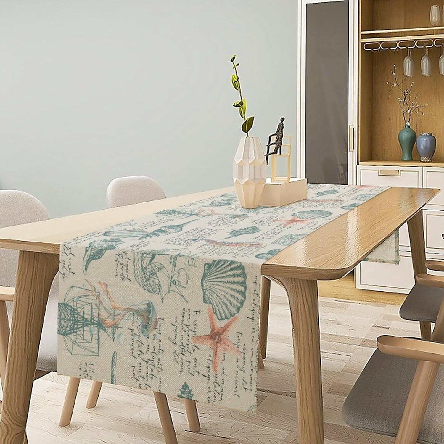 Starfish Table Runner,Seashells Beach Coastal Nautical Sailboat Jellyfish Vintage Hand Drawn Burlap for Hotel Indoors Outdoor Dining Room Kitchen Table Decor, 13x90in