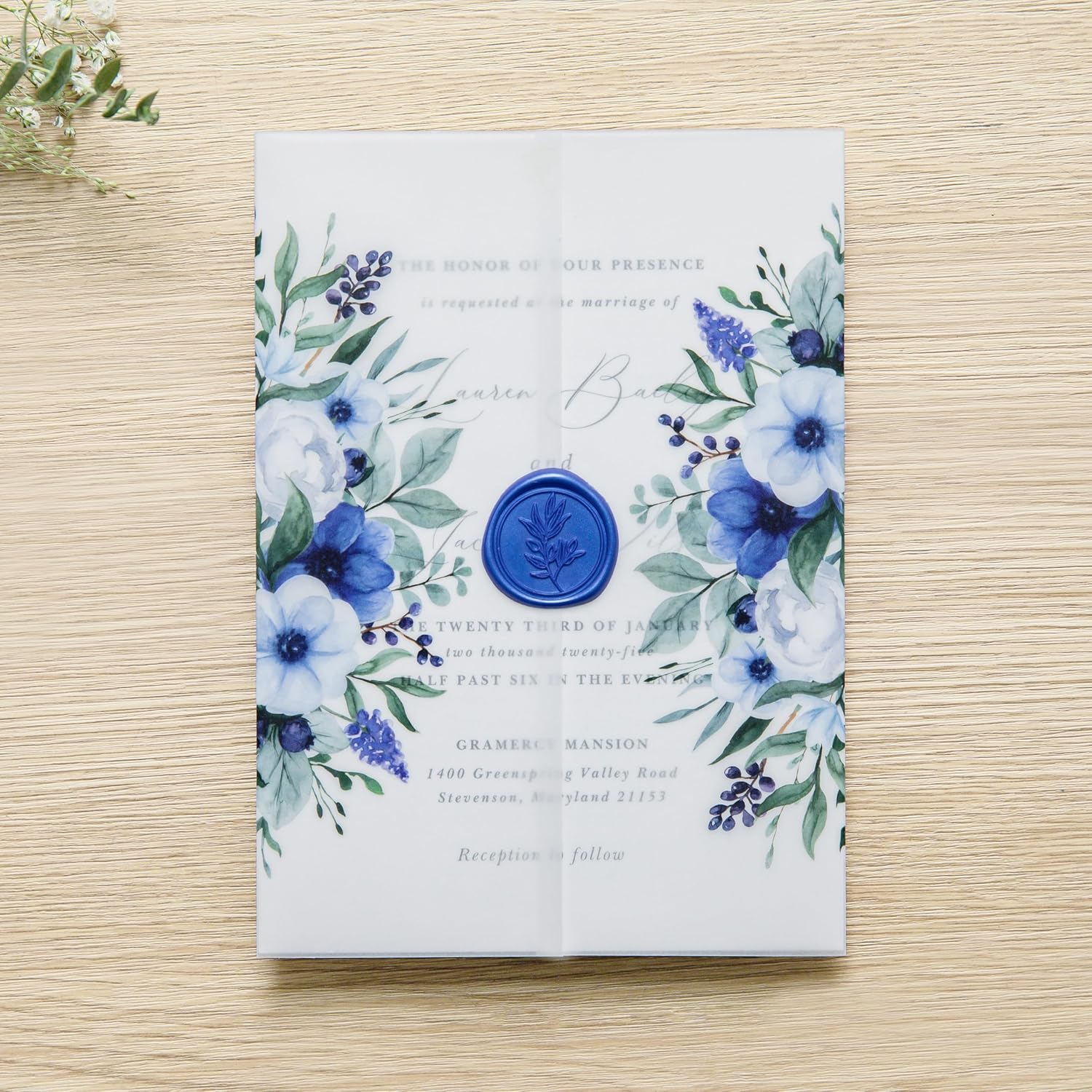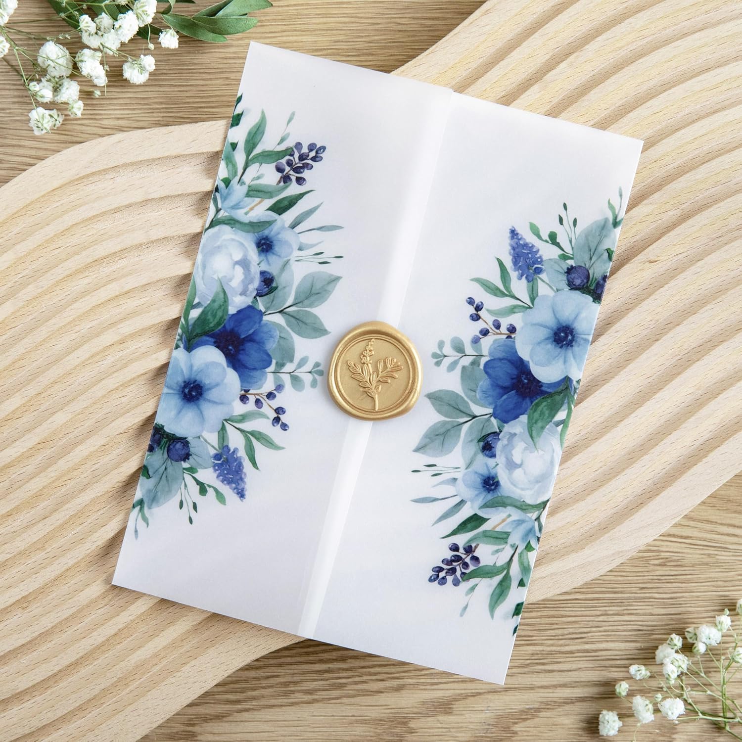 PONATIA 50 PCS Vellum Jackets for 5x7 Invitation Cards - 135GSM Royal Blue Flowers Vellum Sleeves, Transparent Gift Card Jackets