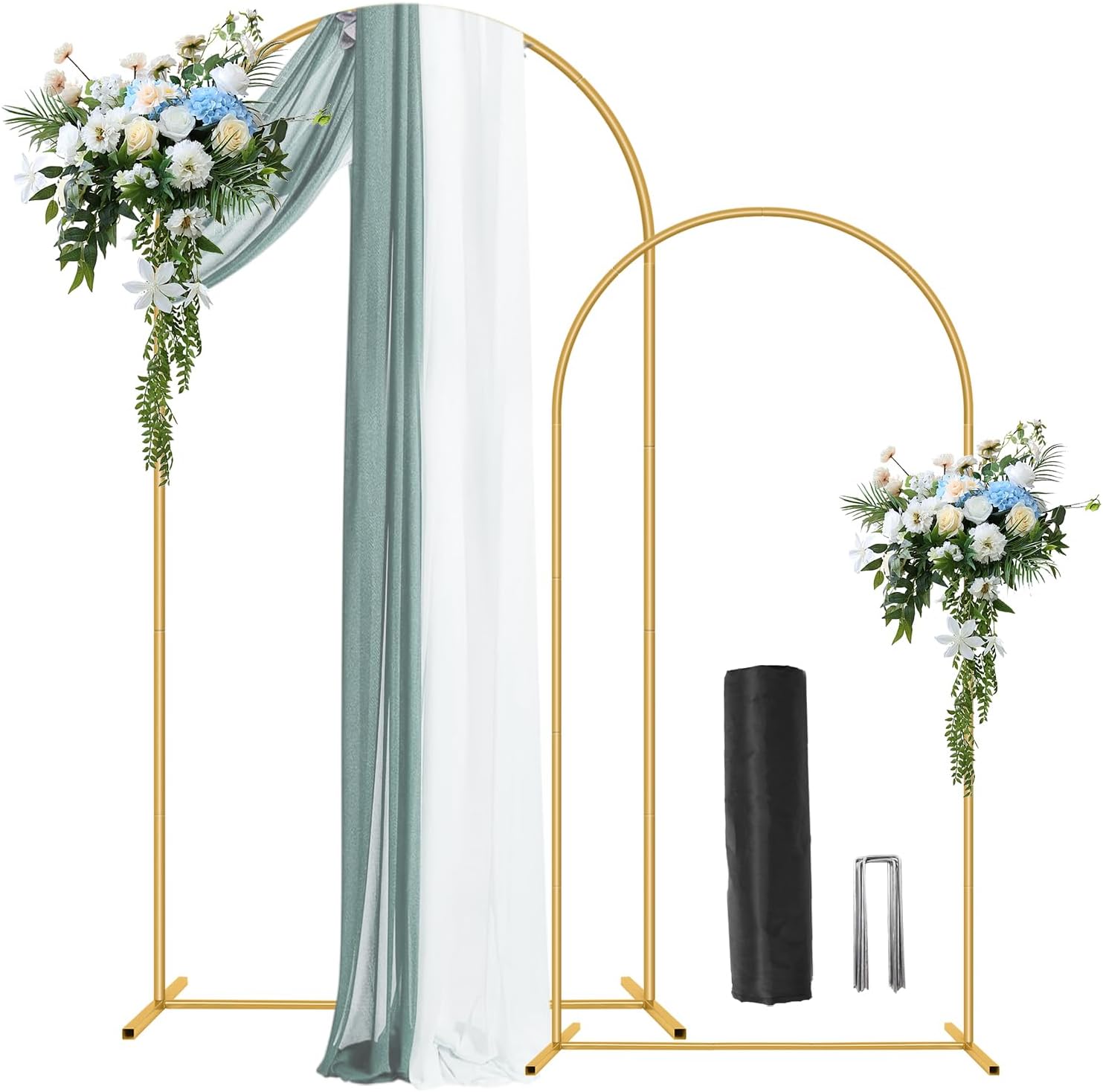 • Set of 2 Unique Wedding Arch Stand: Our arch backdrop stand set include Two different size, meeting your different needs.The sizes are 7.2FT and 6FT.Package contains 1 pc 6 Ft gold wedding arch stand, 1pcs 7.2FT wedding arch, 1pc black storage bag, 8 Pcs U-Shaped Garden Stakes and 2 Pcs 5M Balloon arch strip