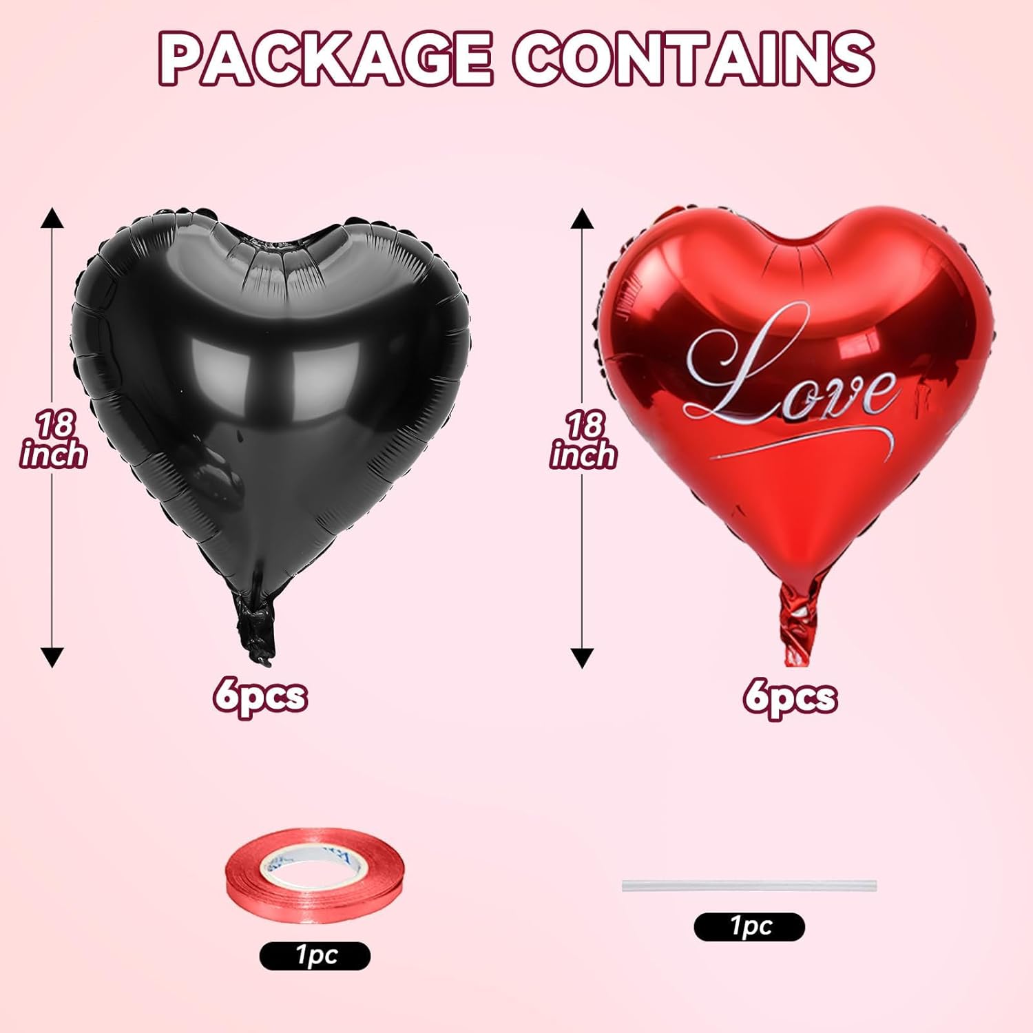 • Valentine's Day Heart Balloons:This 18 inches heart shaped balloons includes 4* red printed heart balloons, 4* red heart balloons, 4* black heart balloons, 1* red ribbon, 1*straw, adding romance and warmth to your celebration. These large heart balloons will be the highlight of your party decorations, creating an atmosphere of love for everyone.