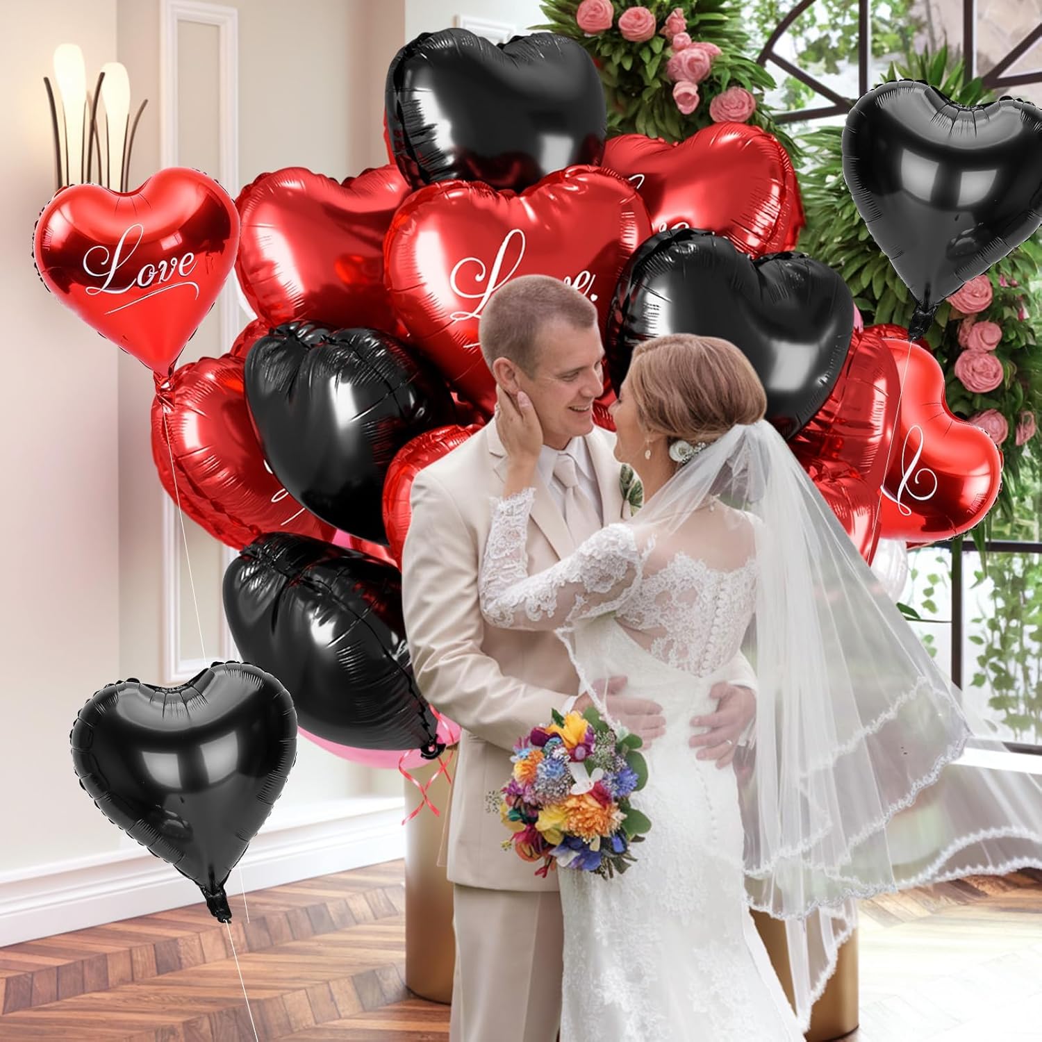 12 Pcs Heart Balloons, 18 inch Valentine's Day Balloons, Red Black Heart Foil Helium Balloon, Love Printed Foil Balloon for Valentine's Day Wedding Baby Shower Anniversary Party Decorations