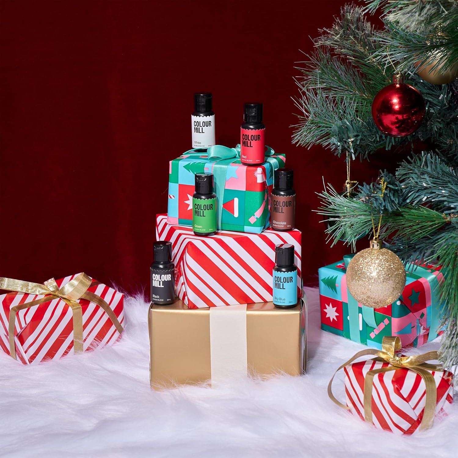Colour Mill Aqua Blend Water-Based Food Coloring, 20 Milliliter Holiday Pack Each of 6 Colors: White, Sky Blue, Green, Black, Chocolate and Red Holiday Pack, 120.0 milliliters, 4.06 Fl Oz