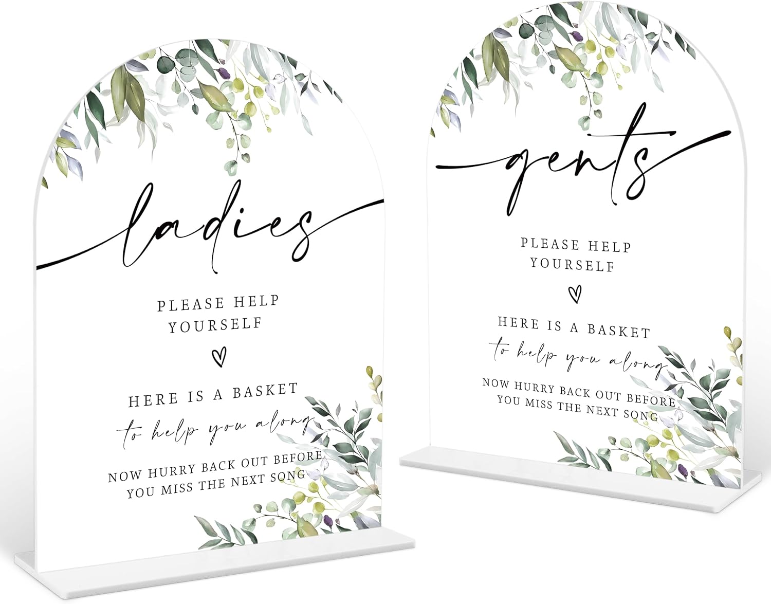2 Pcs Greenery Wedding Bathroom Ladies & Gents Signs, 6 x 8 Inch White Arch Acrylic Wedding Sign with Holder, Wedding Sign for Ceremony and Reception, Wedding Decoration, Wedding Supplies - LY32