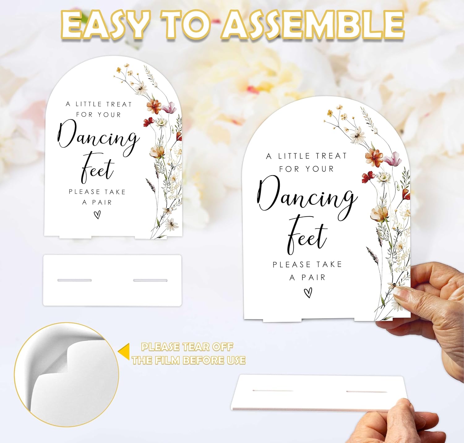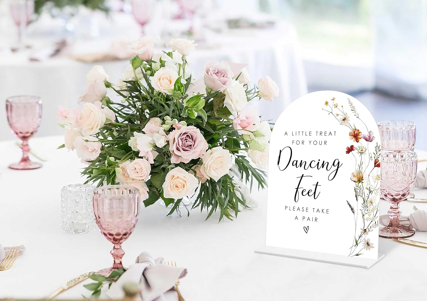 Boho Floral Dancing Feet Sign, 6 x 8 Inch White Arch Acrylic Wedding Sign with Holder, Wedding Sign for Ceremony and Reception, Wedding Decoration, Wedding Supplies - BX24
