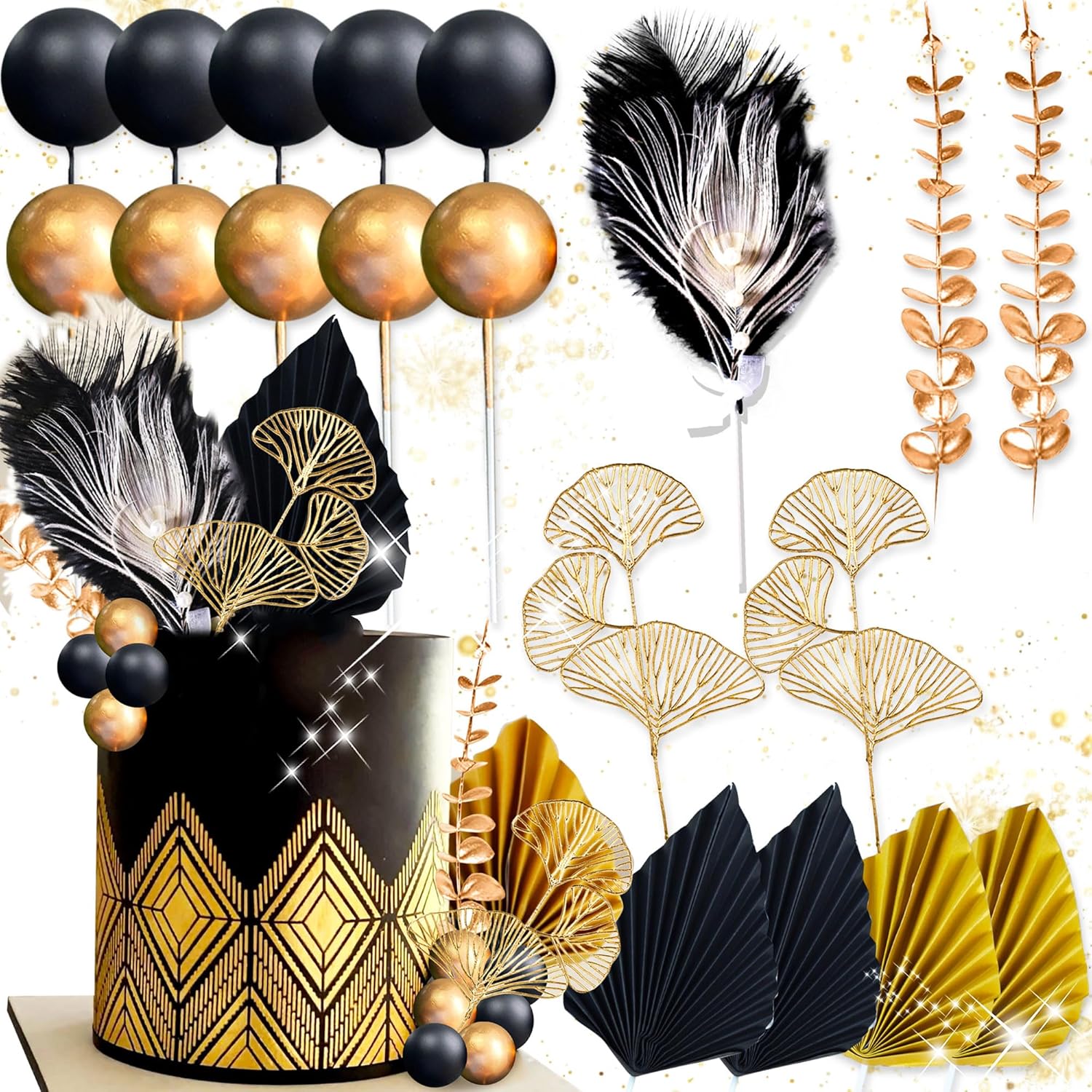 • You will get: 1 x Feather Cake Topper, 5 x Gold Cake Balls, 5 x Black Cake Balls, 4 x Two Different Leaves, 2 x Black Folding Fans, 2 x Gold Folding Fans. The size is as shown in the picture, this is a perfect set of cake toppers for your DIY needs!
