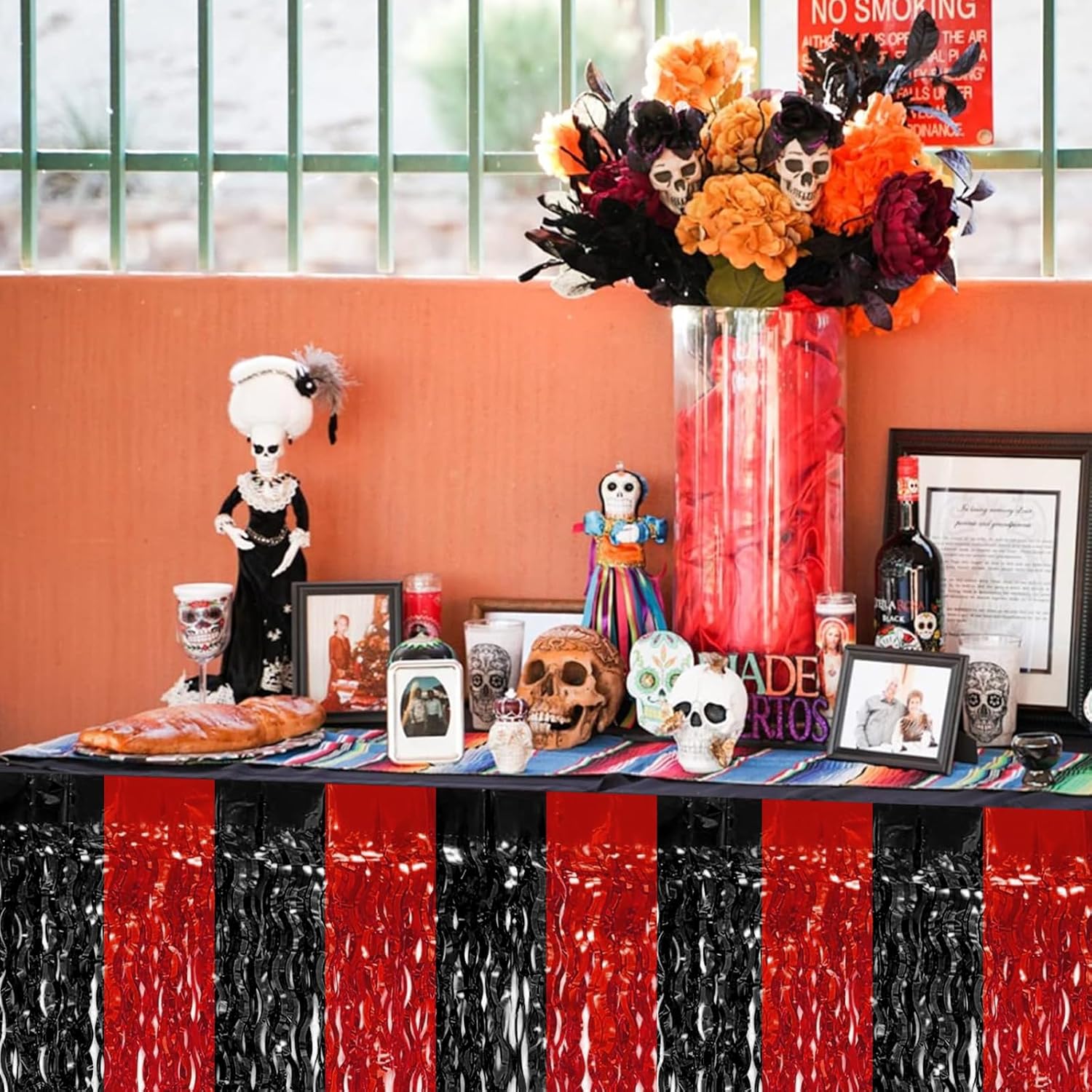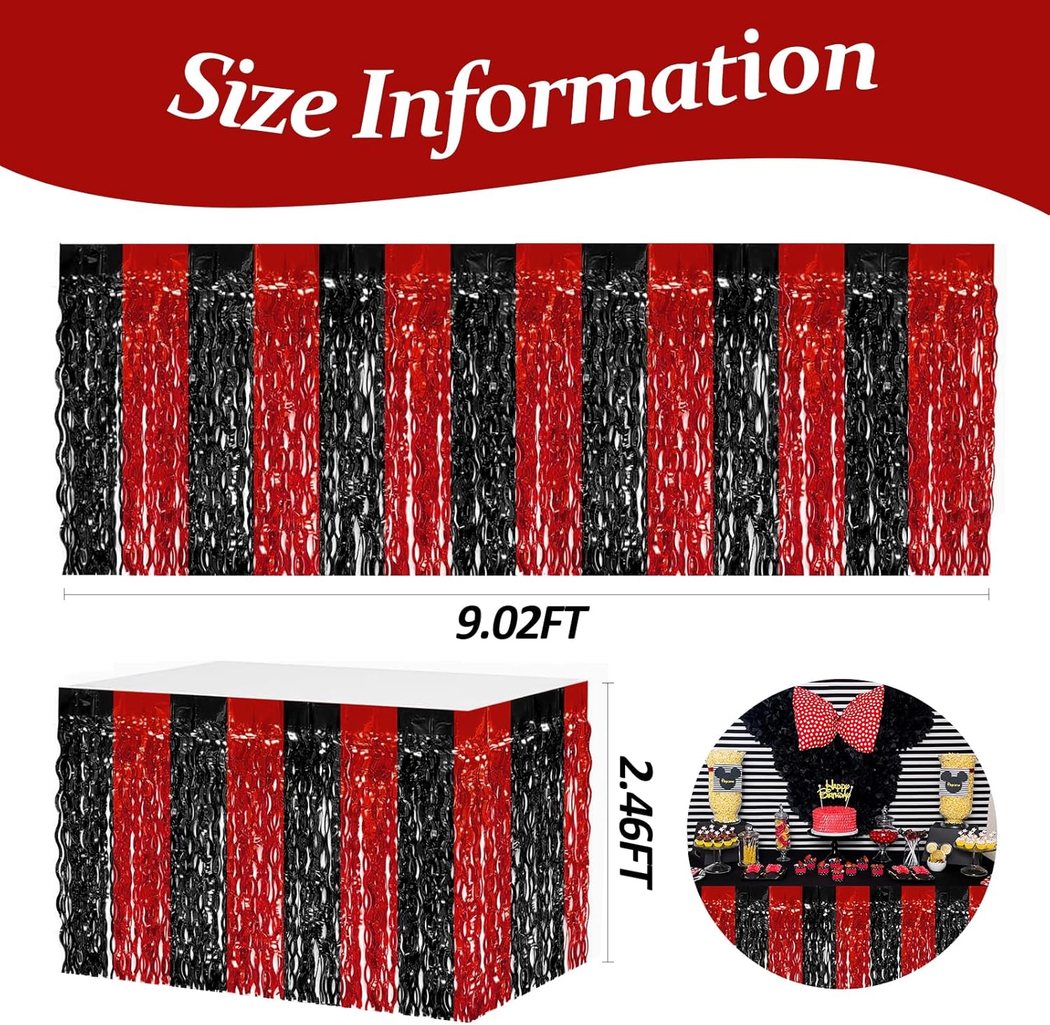 4P Wavy Metallic Tinsel Foil Fringe Table Skirts for Rectangle Tables Backdrop Garland Curtains for Parade Floats Wedding Birthday Parties Decoration Graduation 2025 Christmas (Black Red)