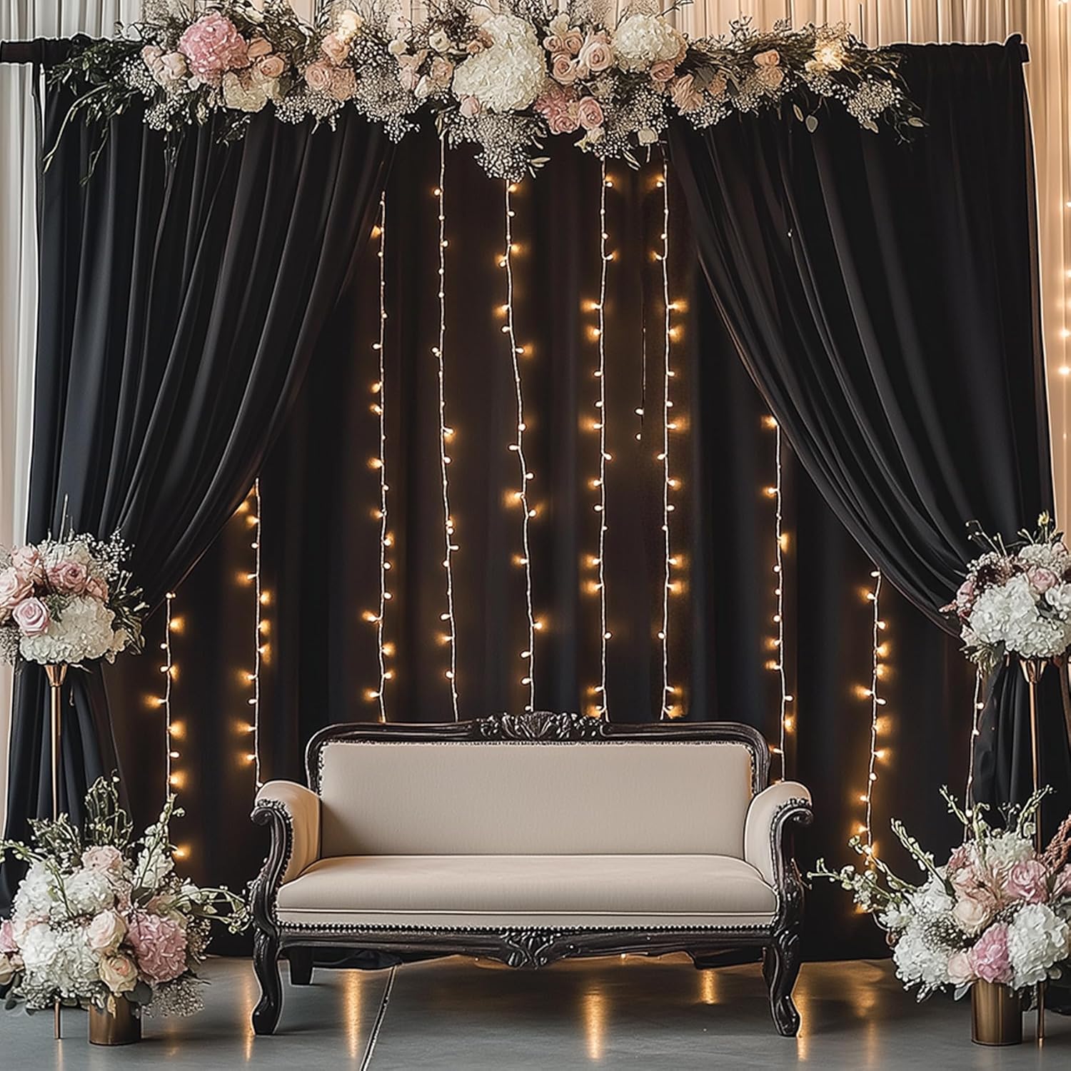 • Wrinkle Free Black Backdrop Curtain: This Black silky soft wedding backdrop for reception is made of wrinkle free material, known for its soft and silky texture, which will give you an extraordinary feeling of touch. The backdrop is exquisitely sewn, smooth and durable fpolyester with natural drape, add more elegance and romance to your weddings.