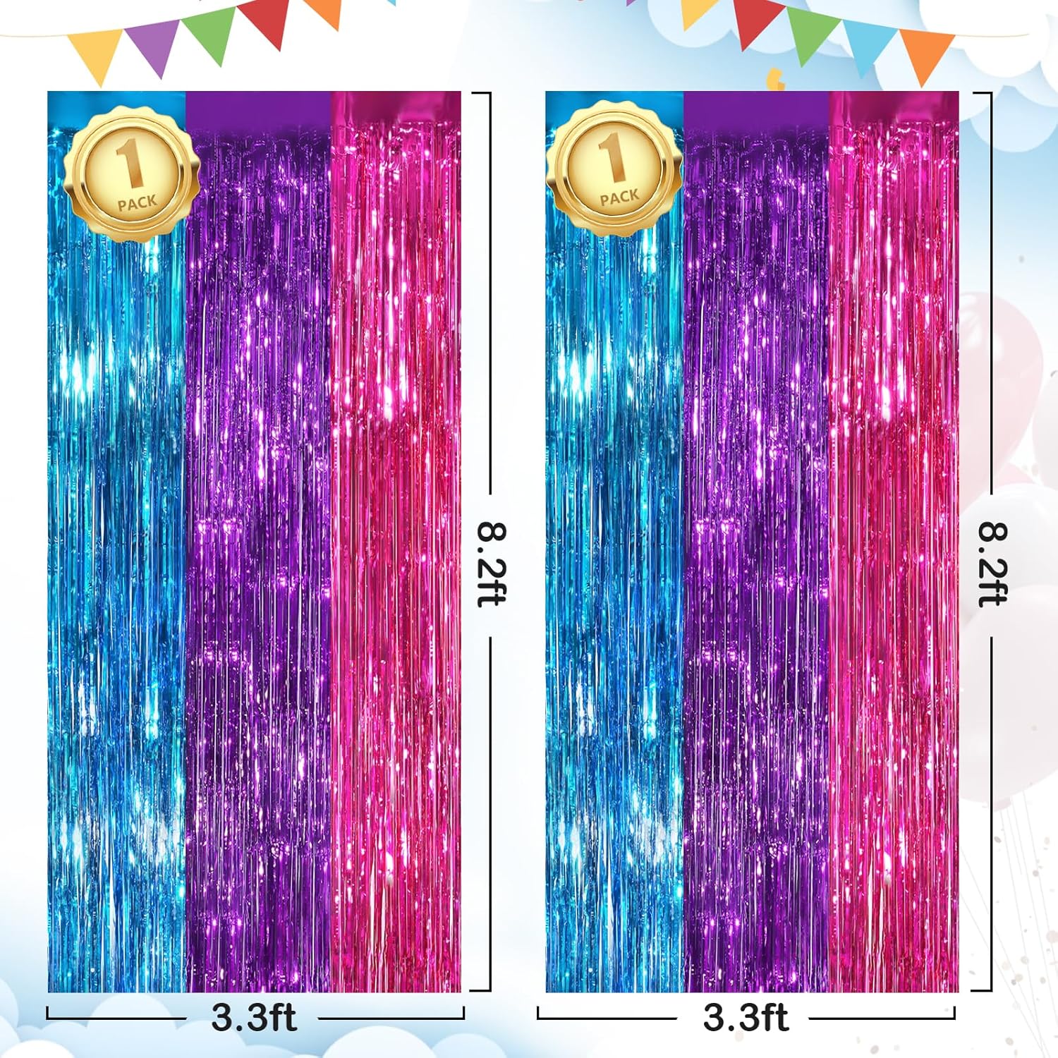 • Materials. The package contains 2 packs of aluminum foil tassel curtains with a size of 3.3 x 8.3ft. It is long enough for any occasion. Please do not stick aluminum foil Streamers curtains to uneven or stained walls to prevent them from falling off