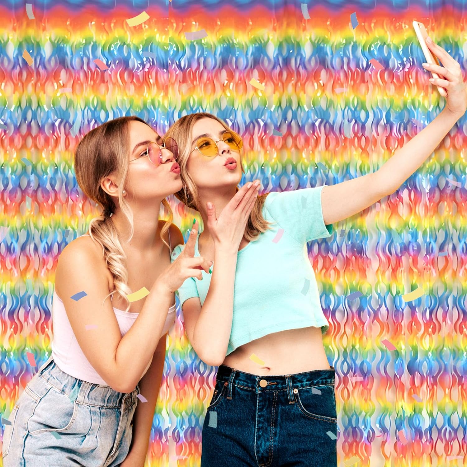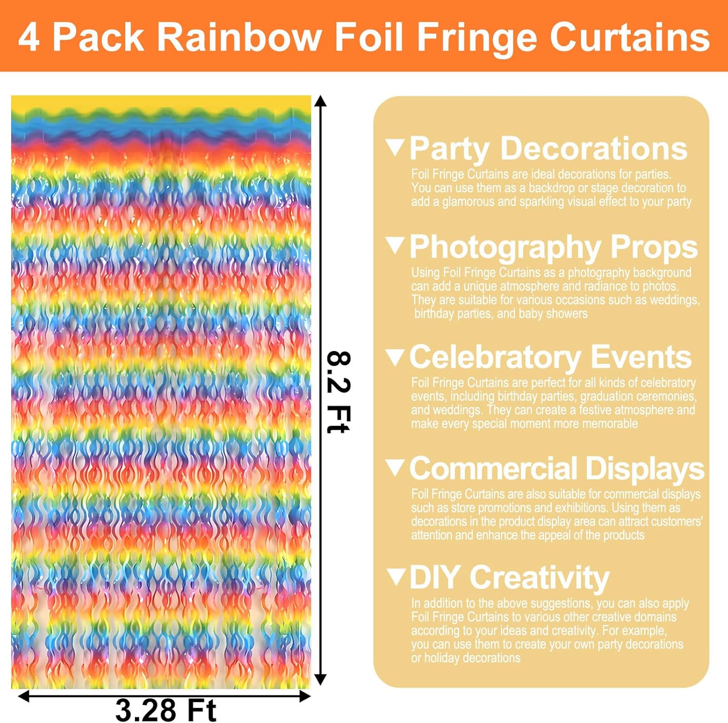 4 Pack Dark Rainbow Wave Foil Fringe Curtain Backdrop, 3.28Ft x 8.2Ft Metallic Tinsel Foil Fringe Streamer Curtains for Photo Booth, Mother's Day, Easter, Birthday, Wedding Party Decoration