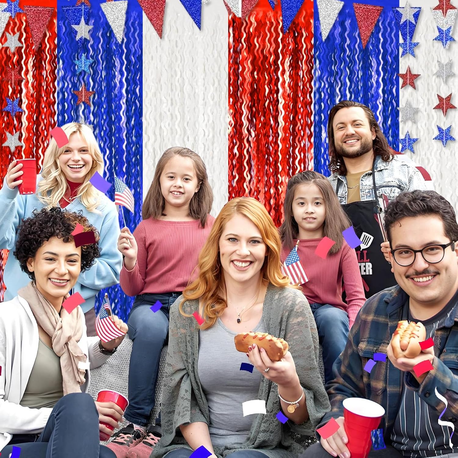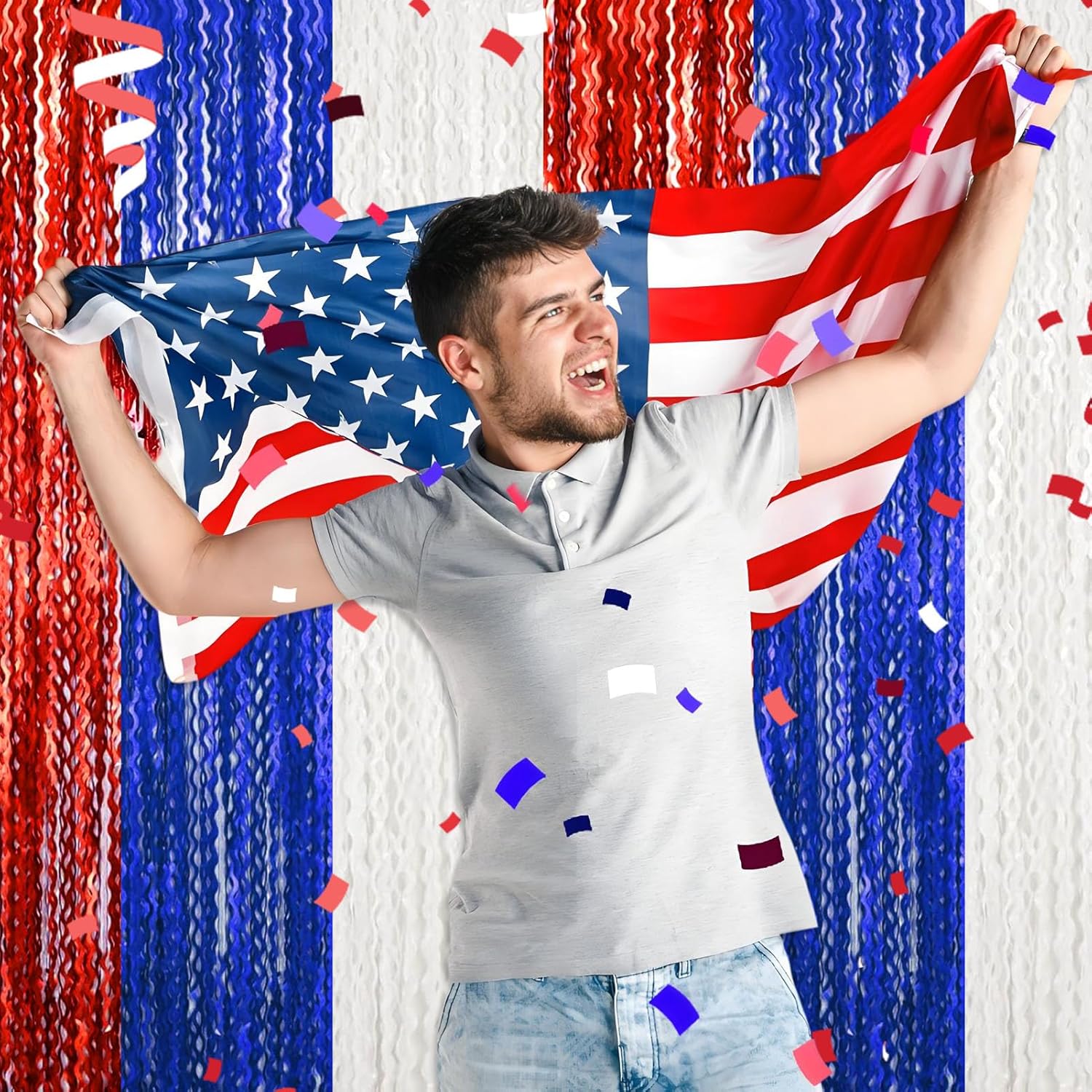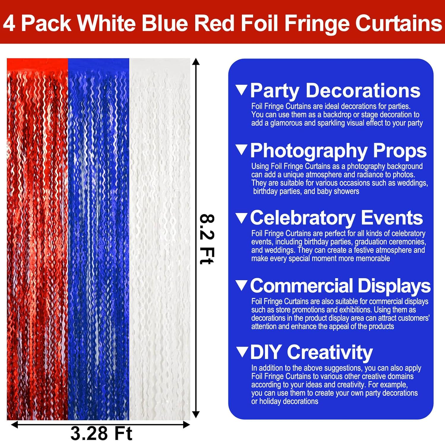 4 Pack White Blue Red Wave Foil Fringe Curtain Backdrop, 3.28Ft x 8.2Ft Metallic Tinsel Foil Fringe Streamer Curtains for Photo Booth, Mother's Day, Easter, Birthday, Wedding Party Decoration