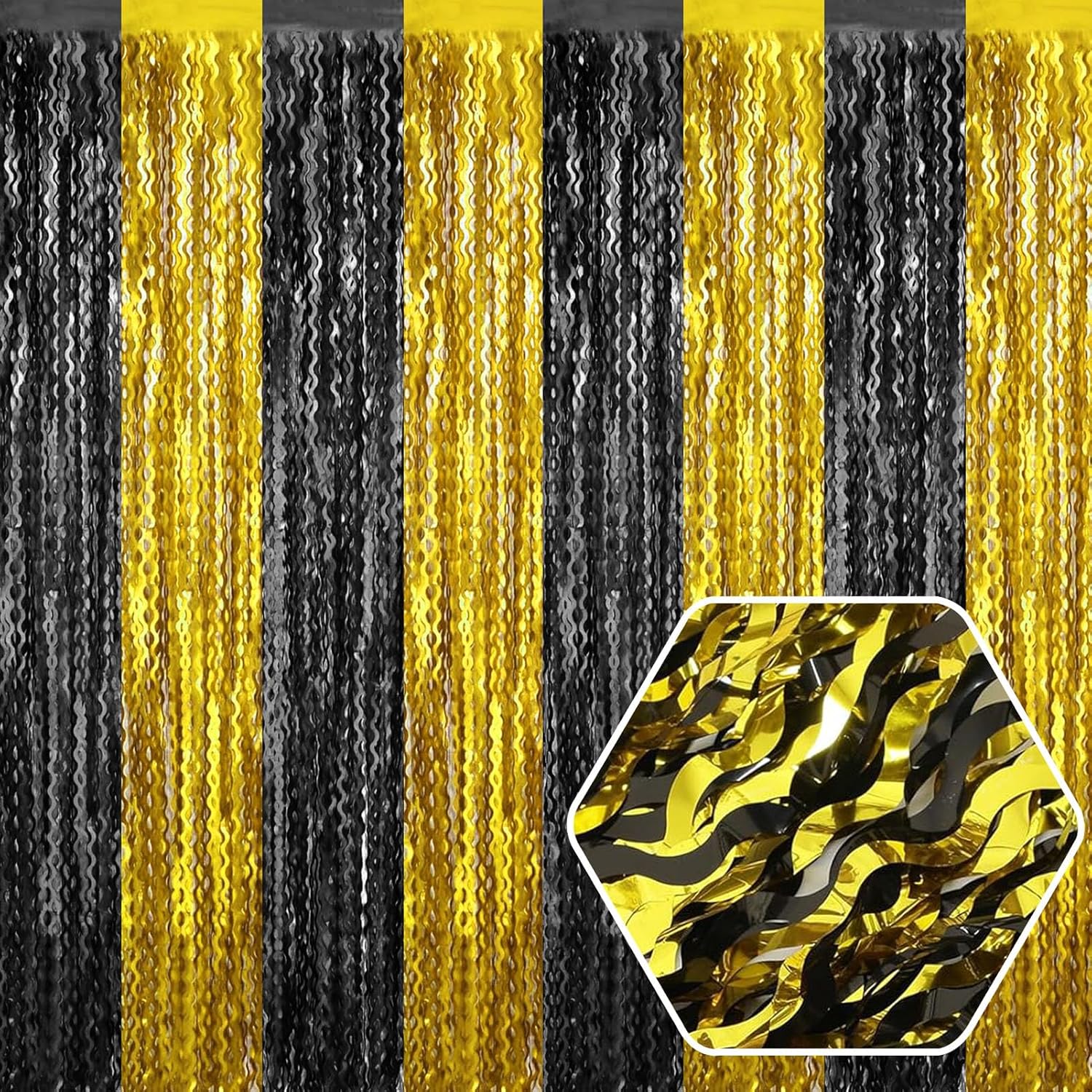 4 Pack Black Gold Wave Foil Fringe Curtain Backdrop, 3.28Ft x 8.2Ft Metallic Tinsel Foil Fringe Streamer Curtains for Photo Booth, Mother's Day, Easter, Birthday, Wedding Party Decoration