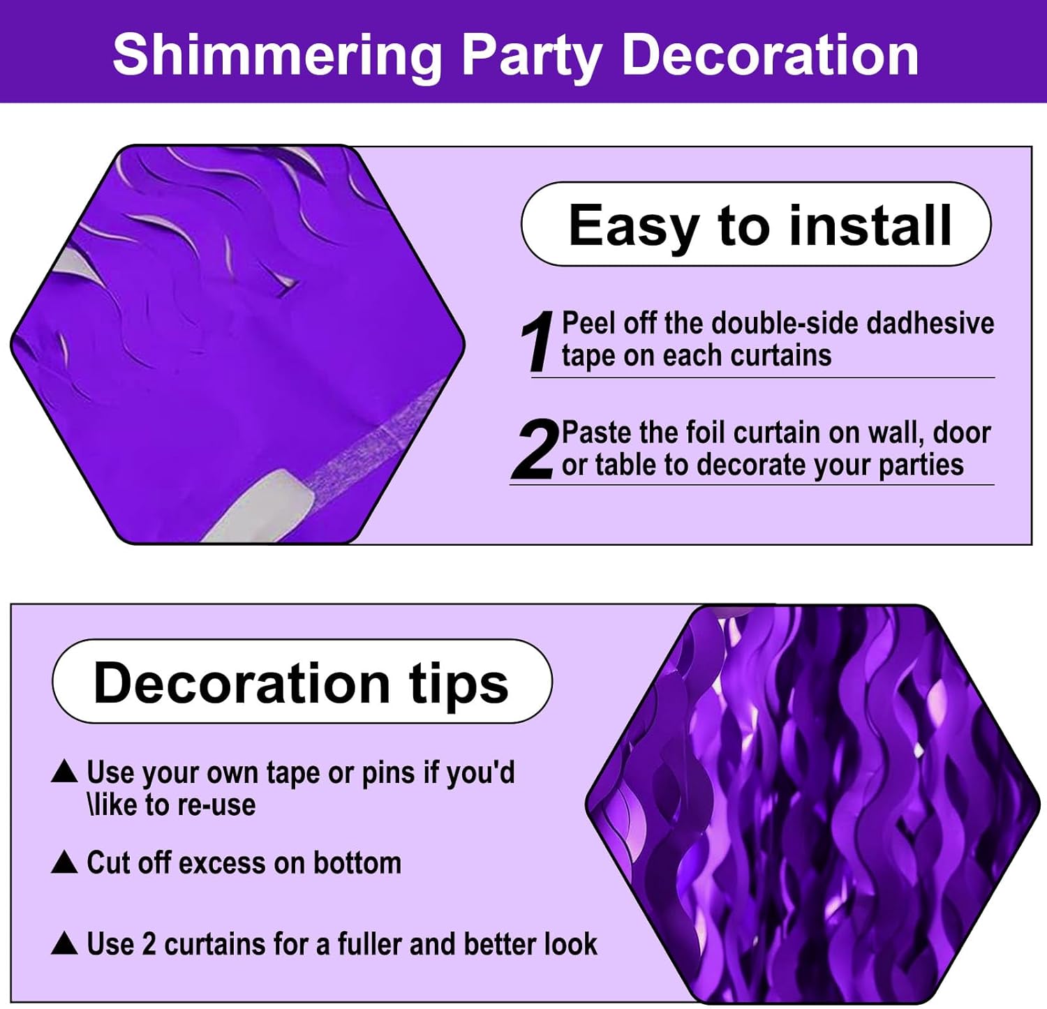 • Easy To Assemble | Strong Adhesive | Not Easy Fade : The foil fringe curtain backdrop party decorations come with double-sided adhesive tape, easy to use, just tear off the back of adhesive tape, then paste this streamers backdrop curtains on the top of wall, window, table, or as door fringe decoration.