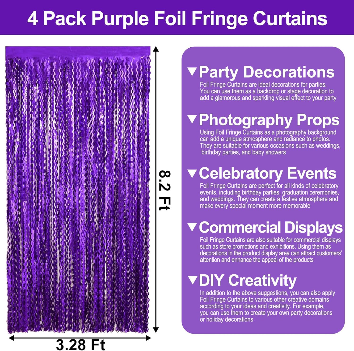 4 Pack Purple Wave Foil Fringe Curtain Backdrop, 3.28Ft x 8.2Ft Metallic Tinsel Foil Fringe Streamer Curtains for Photo Booth, Mother's Day, Easter, Birthday, Wedding Party Decoration
