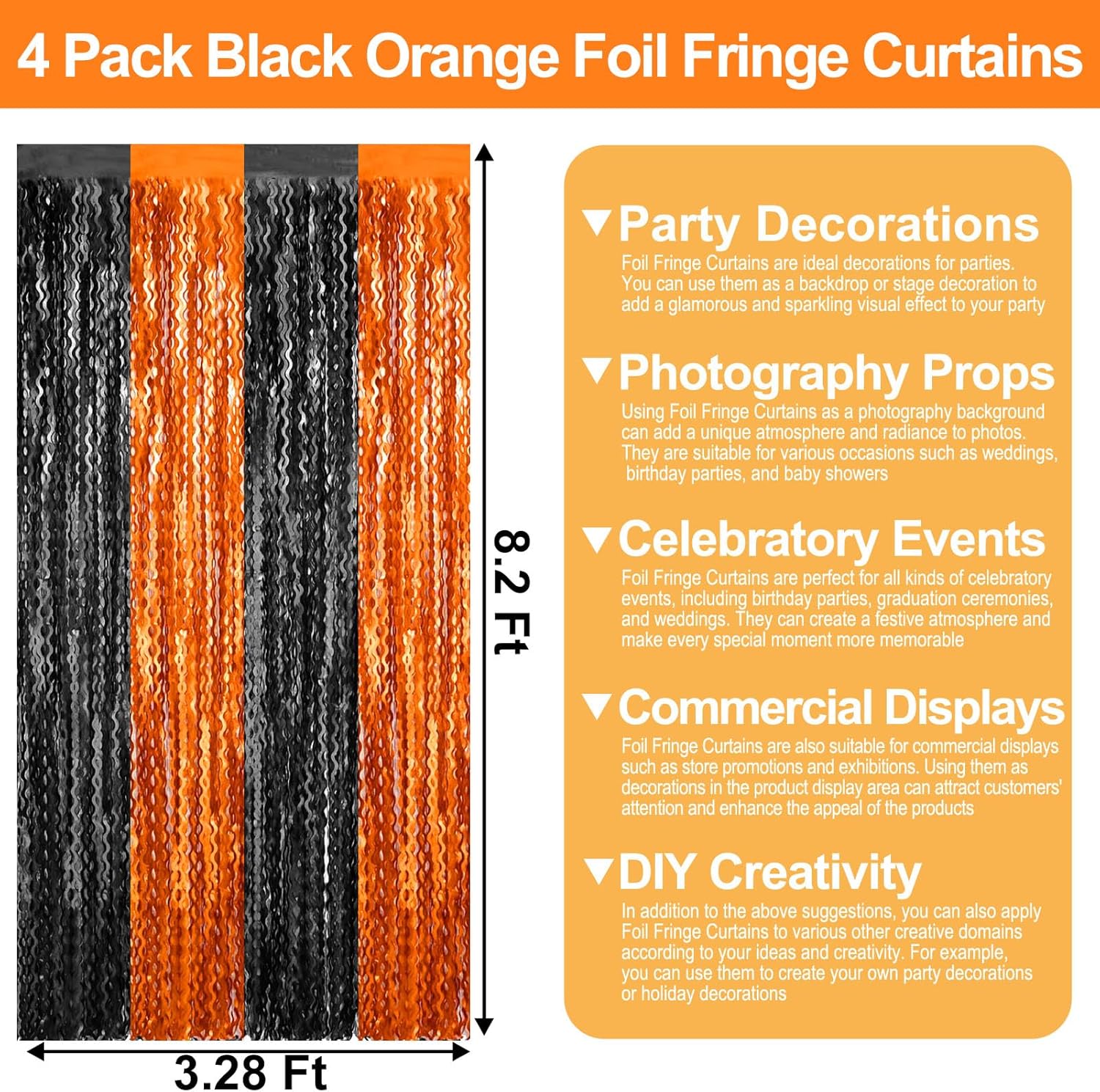 4 Pack Black Orange Wave Foil Fringe Curtain Backdrop, 3.28Ft x 8.2Ft Metallic Tinsel Foil Fringe Streamer Curtains for Photo Booth, Mother's Day, Easter, Birthday, Wedding Party Decoration