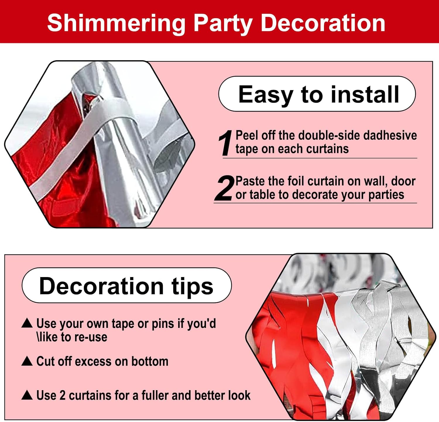 • Easy To Assemble | Strong Adhesive | Not Easy Fade : The foil fringe curtain backdrop party decorations come with double-sided adhesive tape, easy to use, just tear off the back of adhesive tape, then paste this streamers backdrop curtains on the top of wall, window, table, or as door fringe decoration.
