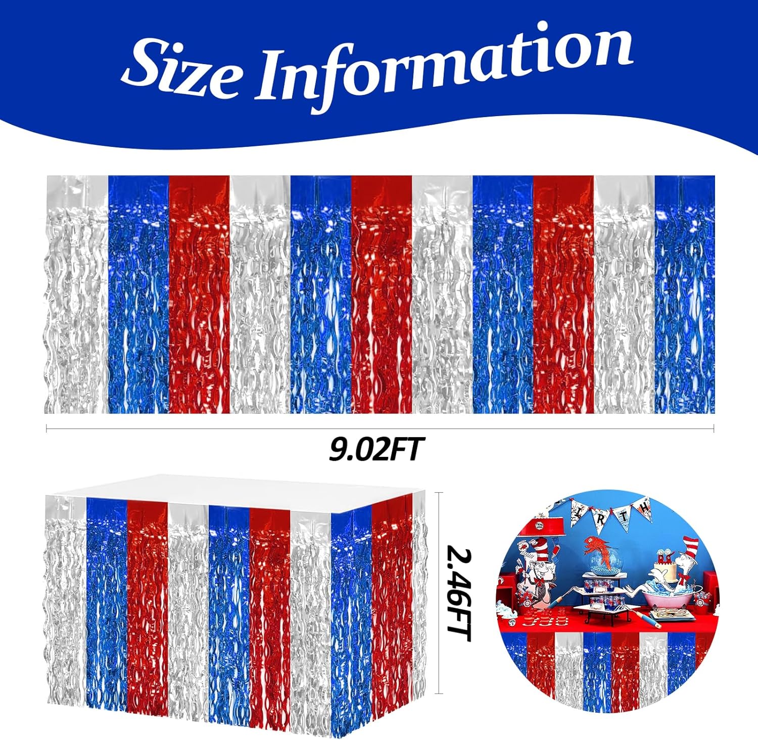 4P Wavy Metallic Tinsel Foil Fringe Table Skirts for Rectangle Tables Backdrop Garland Curtains for Parade Floats Wedding Birthday Parties Decoration Graduation 2025 Christmas (Red Blue White)