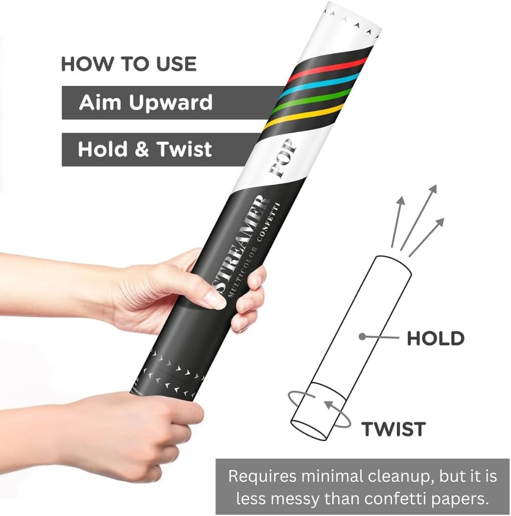 • πŸŽ‰ EASY POINT & TWIST ACTION - Don't need the strongest arms to blow up these babies! Point upwards away from people and twist to shoot, confetti paper is loaded on top of compressed air and is launched by twisting the cannon. Operation manual is included inside the box.