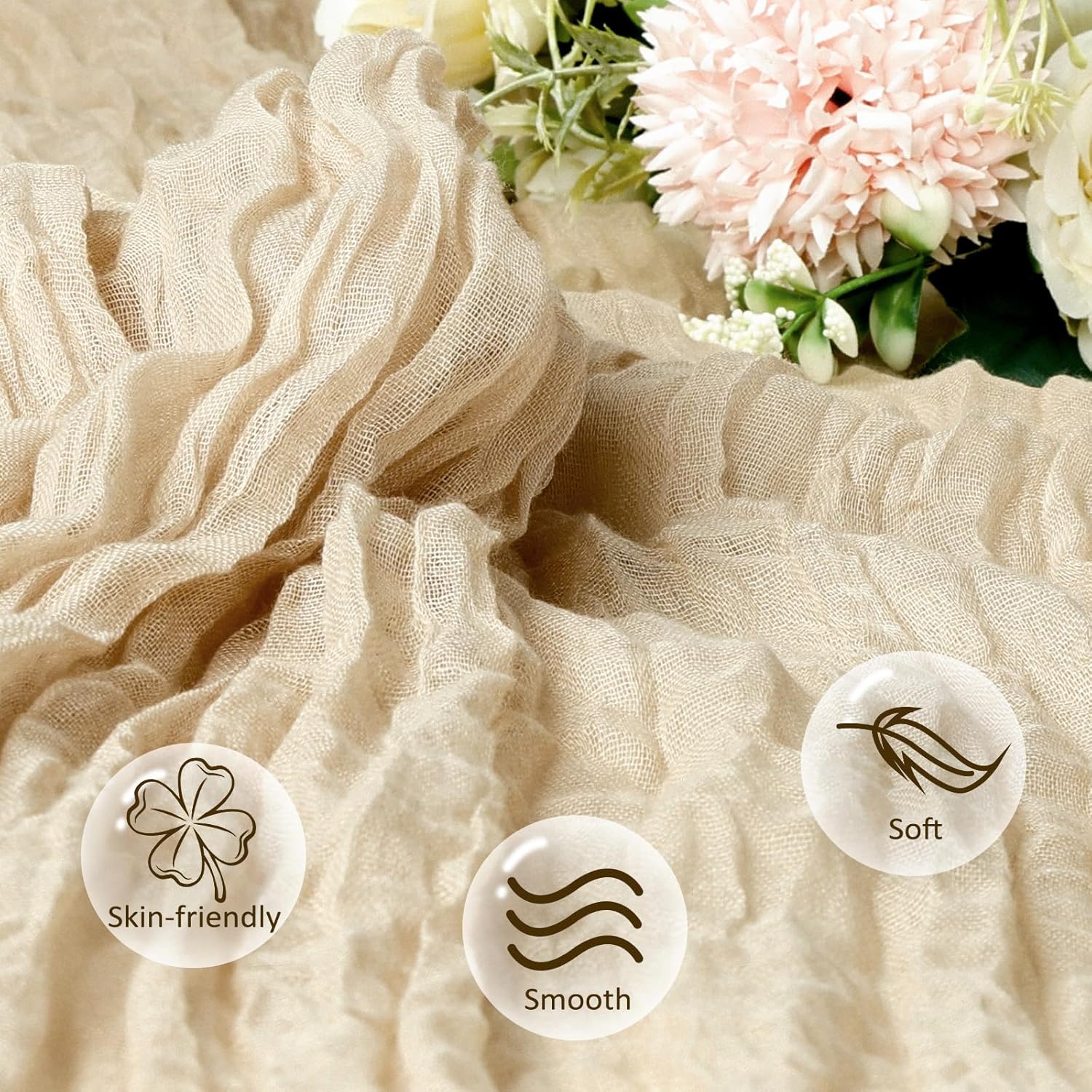 • 【Gorgeous Looking】Our Cheese Cloth Table Runner Are Meticulously Crafted From High Polyester Fabric, With Fine And Dense Texture. Not Only Do They Feel Skin-Friendly, Smooth And Soft When Touched, But Also Present An Elegant Appearance Visually, Our Gauze Table Runner Is Truly An Excellent Decoration For Your Table.
