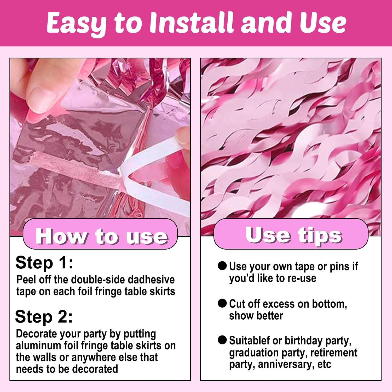 • Beautiful decoration: you can use these tinsel fringe table skirt to decorate a classroom, the stage for school program, a homecoming float, a wedding decoration, birthday party, Disco party, baby shower, halloween, christmas, new year's eve, bachelorette party, anniversary Memorial, Hollywood Party, independence Day, Carnival Party, Bridal Shower, Graduation and more.