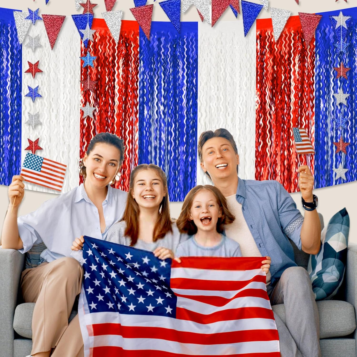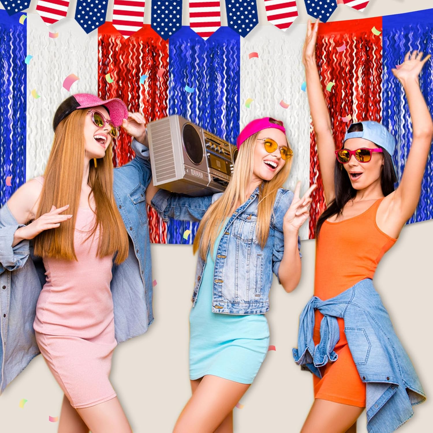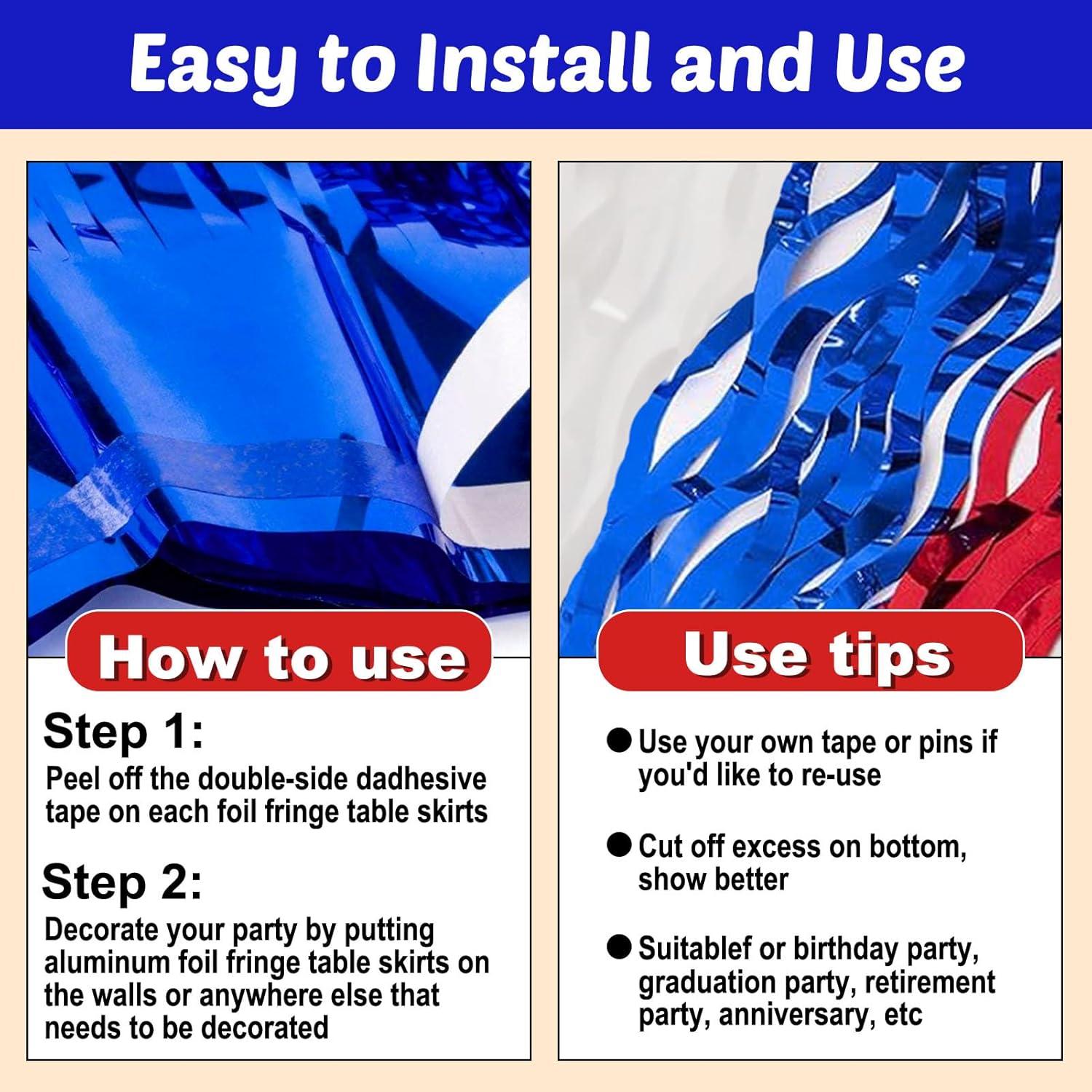 6 Pack 29x108 Inch White Blue Red Wave Foil Fringe Table Skirts Metallic Banner for Tinsel Streamer Garland Backdrop for Parade Floats Wedding, Mother's Day, Birthday Mardi Gras Party Decorations
