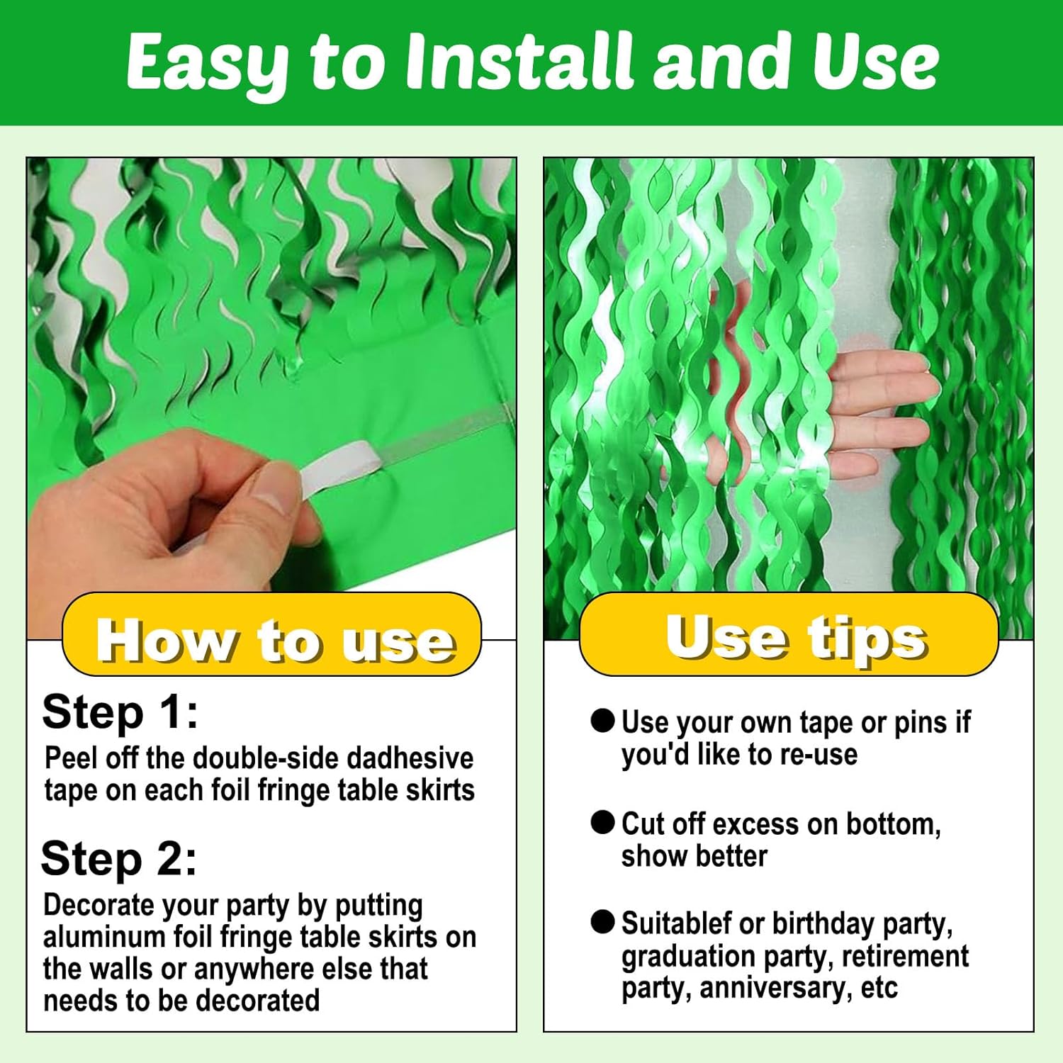 6 Pack 29x108 Inch Green Wave Foil Fringe Table Skirts Metallic Banner for Tinsel Streamer Garland Backdrop for Parade Floats Wedding, Mother's Day, Birthday Mardi Gras Party Decorations