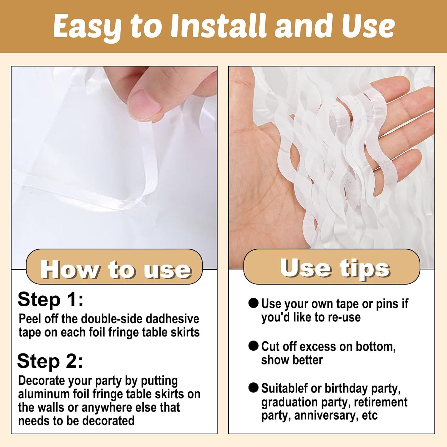 • Beautiful decoration: you can use these tinsel fringe table skirt to decorate a classroom, the stage for school program, a homecoming float, a wedding decoration, birthday party, Disco party, baby shower, halloween, christmas, new year's eve, bachelorette party, anniversary Memorial, Hollywood Party, independence Day, Carnival Party, Bridal Shower, Graduation and more.