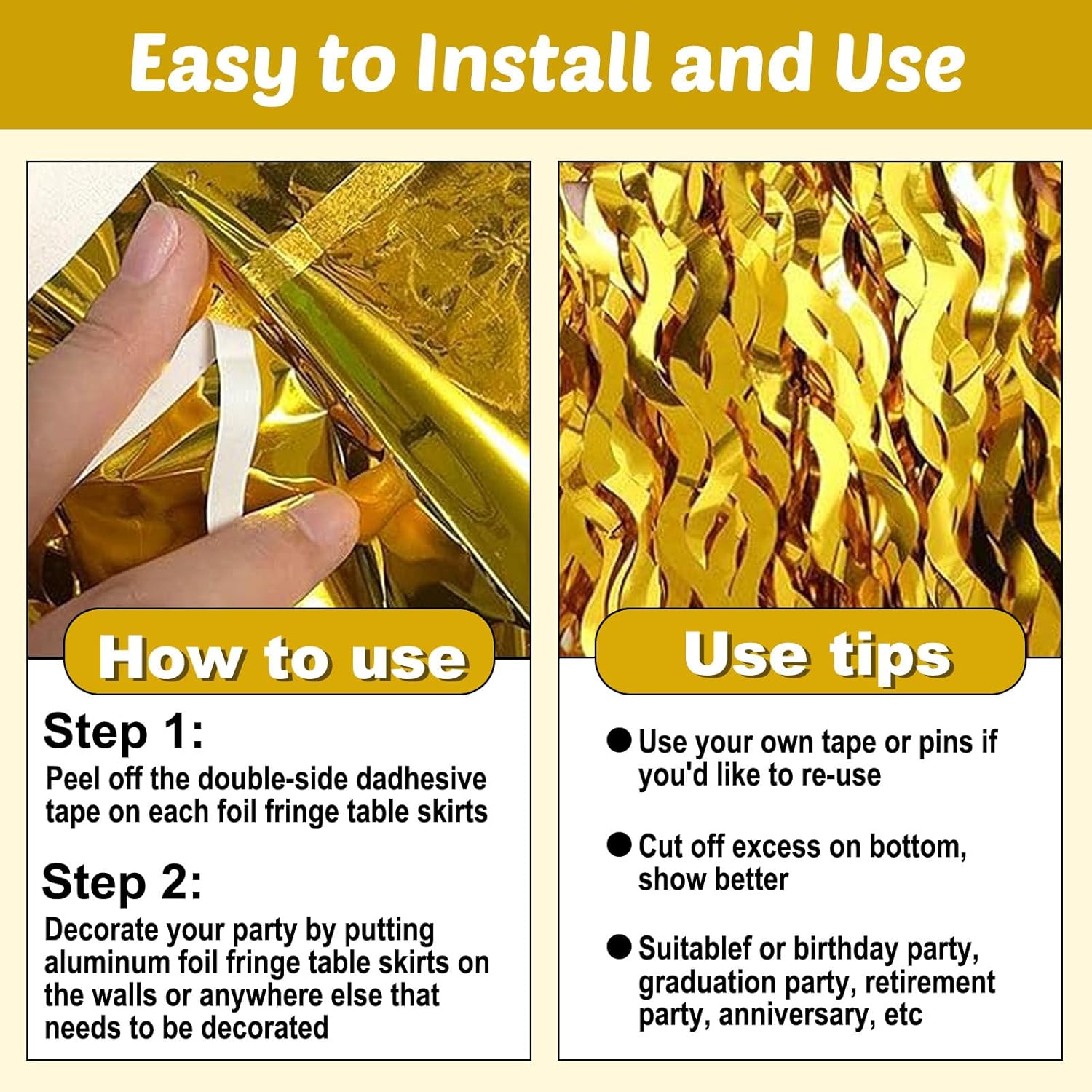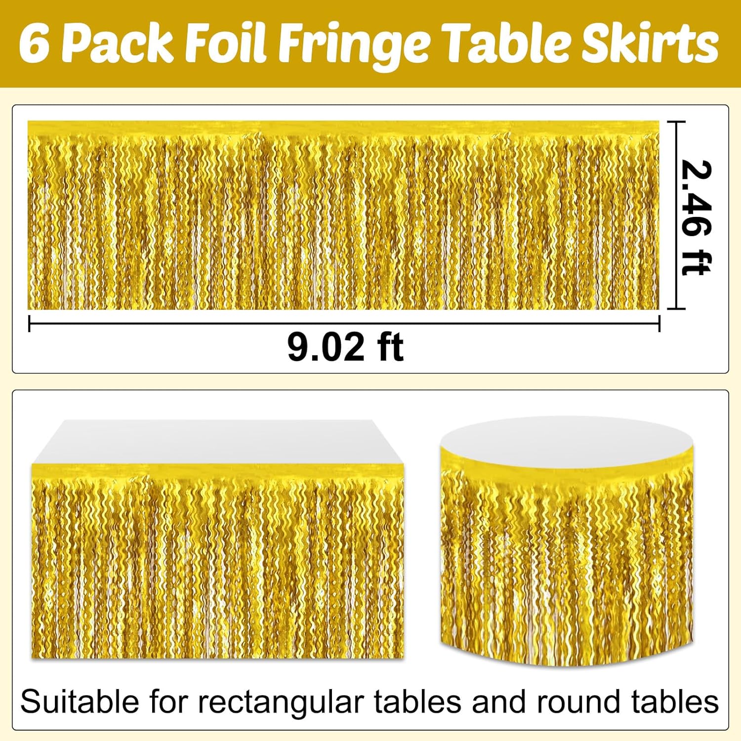 • Package Includes: 6pcs/set metallic fringe table skirts / shiny tassel banner, beautiful and shiny, provide you with great decoration effects, Each pack of table skirt measures 29x108 inches. Each one will be 9 Ft long, 6 pack will cover 54 FT length of tables.
