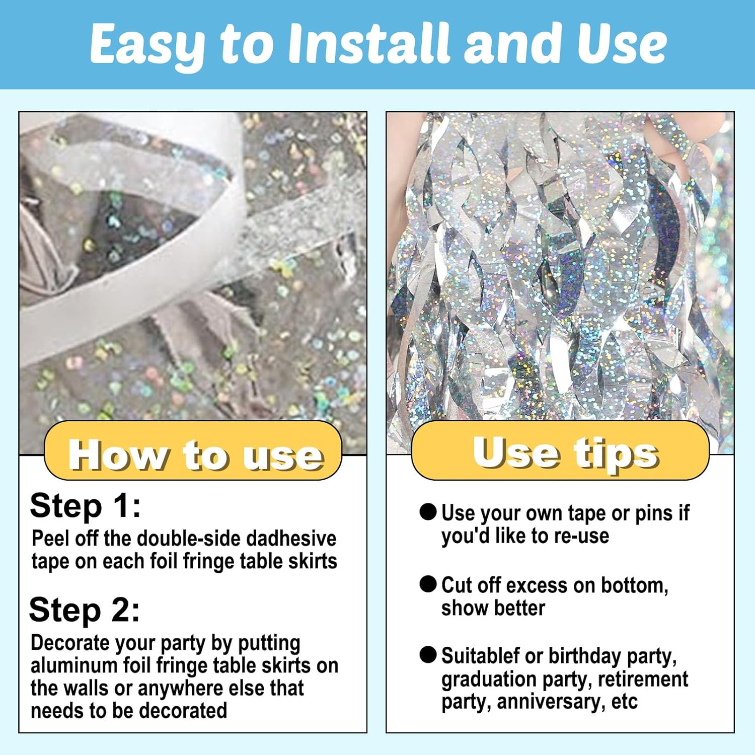 • Beautiful decoration: you can use these tinsel fringe table skirt to decorate a classroom, the stage for school program, a homecoming float, a wedding decoration, birthday party, Disco party, baby shower, halloween, christmas, new year's eve, bachelorette party, anniversary Memorial, Hollywood Party, independence Day, Carnival Party, Bridal Shower, Graduation and more.