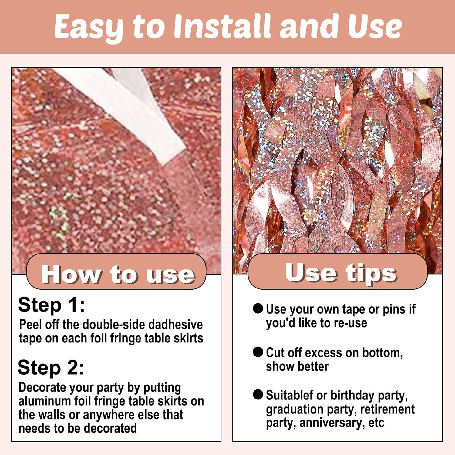 • Beautiful decoration: you can use these tinsel fringe table skirt to decorate a classroom, the stage for school program, a homecoming float, a wedding decoration, birthday party, Disco party, baby shower, halloween, christmas, new year's eve, bachelorette party, anniversary Memorial, Hollywood Party, independence Day, Carnival Party, Bridal Shower, Graduation and more.