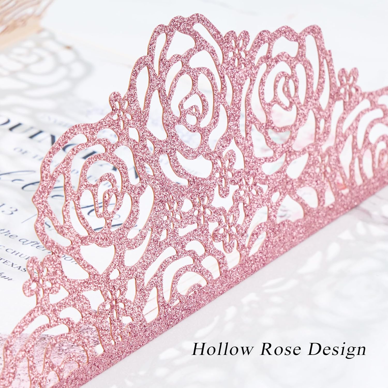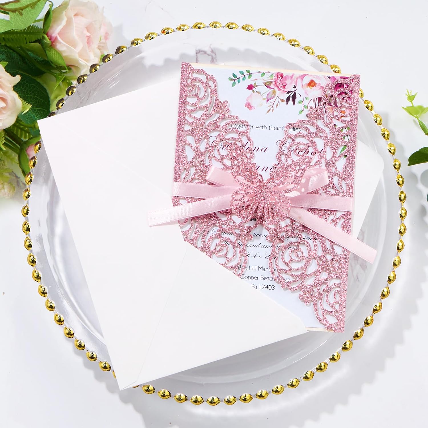 • Glitter Pink Wedding Invitations Personalized :High-quality laser cutting technology, glitter invitations brings high-quality experience,clear printing and neat layout for the 250GSM pearl paper insert, spice up your party.
